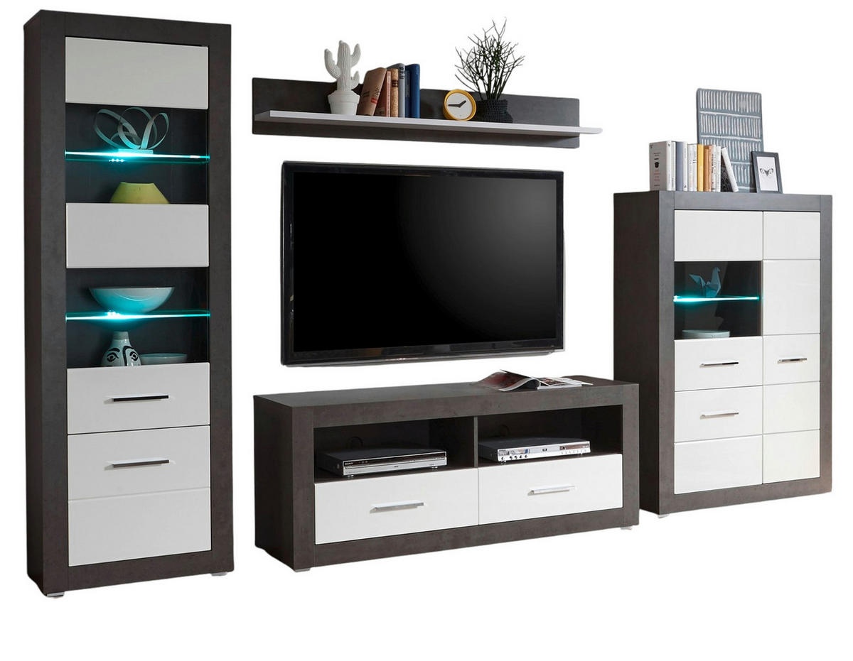 Furn.Design WOHNWAND weiß Hochglanz, grau Stone 4-teilig 335 x 198 cm, Wohnkombination modernes Design