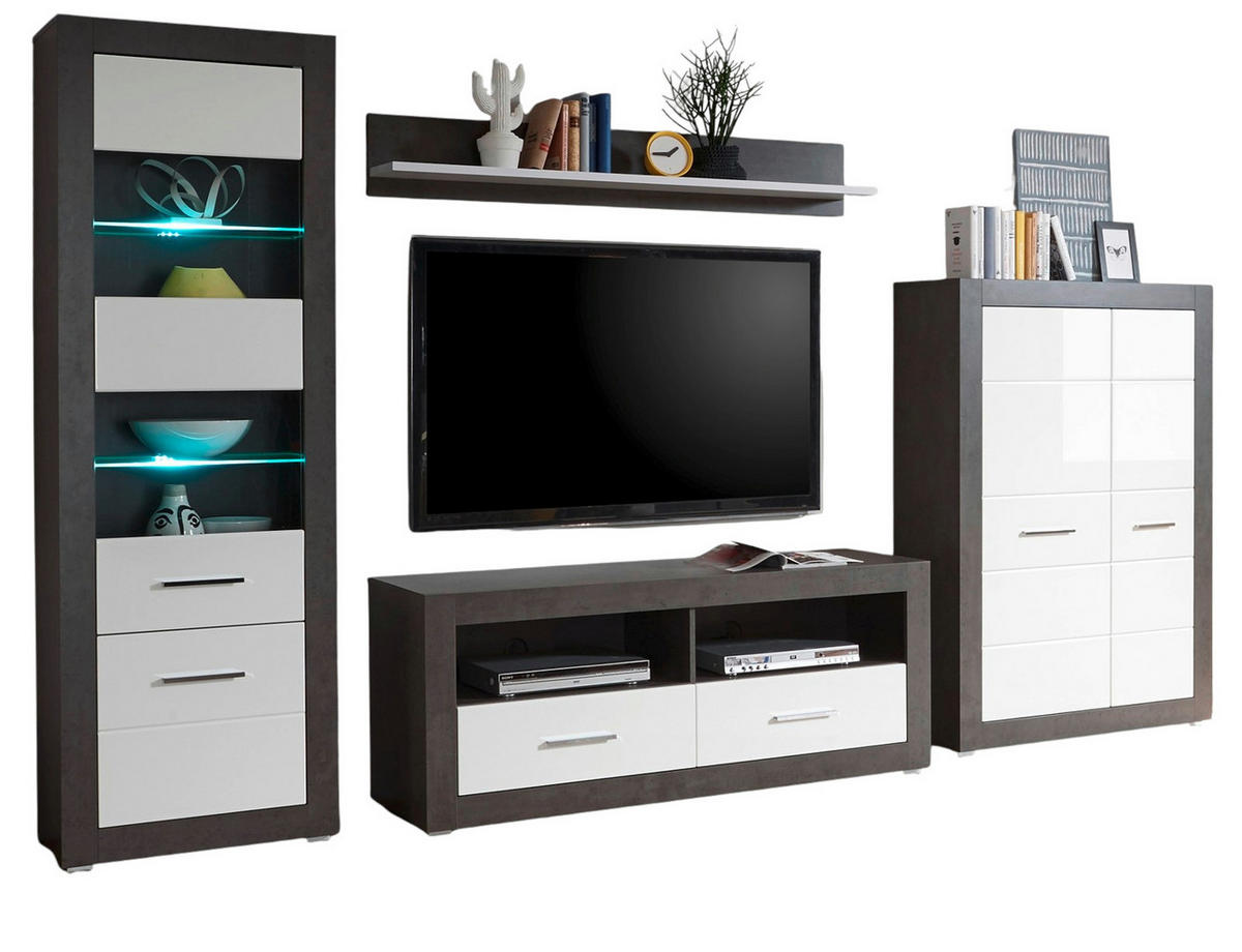 Wohnwand "Briard", weiß Hochglanz und grau Stone, 4-teilig, 335 x 198 cmMit dieser 4-teiligen Wohnkombination holen Sie sich ein Stück Wohlbefinden in Ihr Heim. Das geschmackvolle, moderne Design harmoniert hervorragend mit geradezu jedem Einrichtungskonzept. Diie Wohnwand besitzt ein TV-Element, ein Wandboard, ein Highboard und eine Vitrine. Das Modell "Briard" in weiß Hochglanz und grau Stone (335 x 198 cm) überzeugt mit zwei Schubladen. Hinter einer Glastür und drei Türen haben Sie Platz zum Verstauen diverser Gegenstände und Deko. Berücksichtigen Sie die weiteren Größenausführungen dieser Wohnkombination. Die exzellente Qualität der verwendeten Werkstoffe zeigt sich in ihrer pflegeleichten Beschaffenheit. Die Wohnwand "Briard" hat 13 Fächer und ist in hochglänzendem Weiß sowie Stone Design Grau gehalten. Darüber hinaus steht das Modell "Briard" durch das FSC®-Label für nachhaltige Forstwirtschaft. Sein Stellmaß beträgt 335 x 198 x 45 cm.