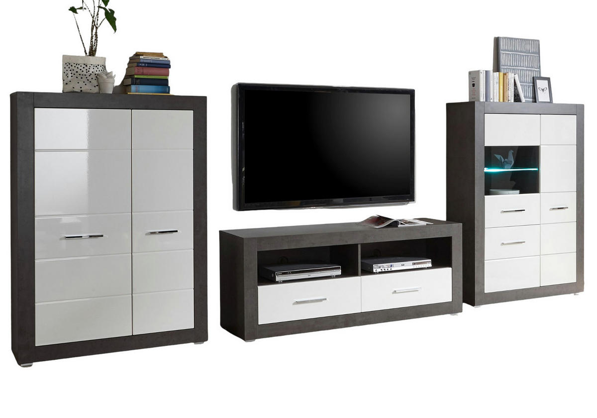 Wohnwand "Briard", weiß Hochglanz und grau Stone, 4-teilig, 370 x 170 cmMit dieser Wohnwand holen Sie sich ein Stück Wohlbefinden in Ihr Heim. Das 4-teilige Möbelstück besteht aus den folgenden Elementen: einer Vitrine, einem Wandboard, einem Highboard sowie einem TV-Element. Es vervollständigt Ihr persönliches Einrichtungskonzept durch das moderne, geschmackvolle Design und leistet mit dem FSC®-Gütesiegel einen Beitrag zu mehr Nachhaltigkeit. Das Modell "Briard" in weiß Hochglanz und grau Stone (370 x 170 cm) hat zwei Schubladen und ist mit vier Türen sowie einer Glastür versehen, hinter welchen verschiedenste Gegenstände und Deko verstaut werden können. Die Wohnkombination ist mit sechs Einlege-, einem Fach- und einem Glasboden ausgestattet. Sie ist durch ihre 13 Fächer sehr funktional und steht in unterschiedlichen Größenvarianten zur Verfügung. Dank der pflegeleichten Beschaffenheit werden Sie viel Freude an dieser Wohnwand haben. Diese Wohnwand schafft in jedem Zuhause eine gemütliche Atmosphäre.