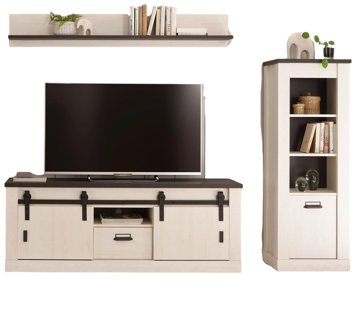 Furn.Design WOHNWAND weiß Pinie, anthrazit Landhaus, Wohnkombination 3-teilig 233 cm
