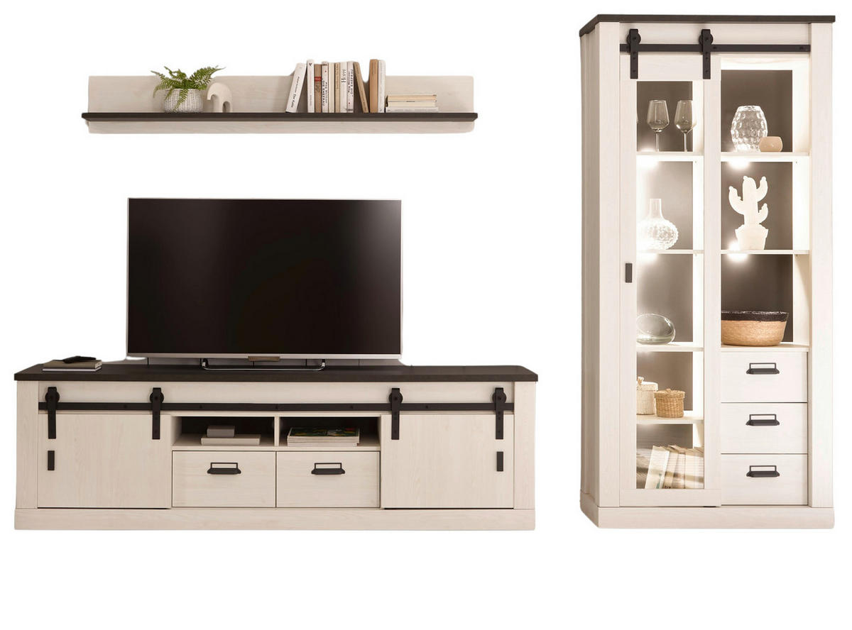 Furn.Design WOHNWAND weiß Pinie, anthrazit Landhaus, Wohnkombination 3-teilig 314 cm