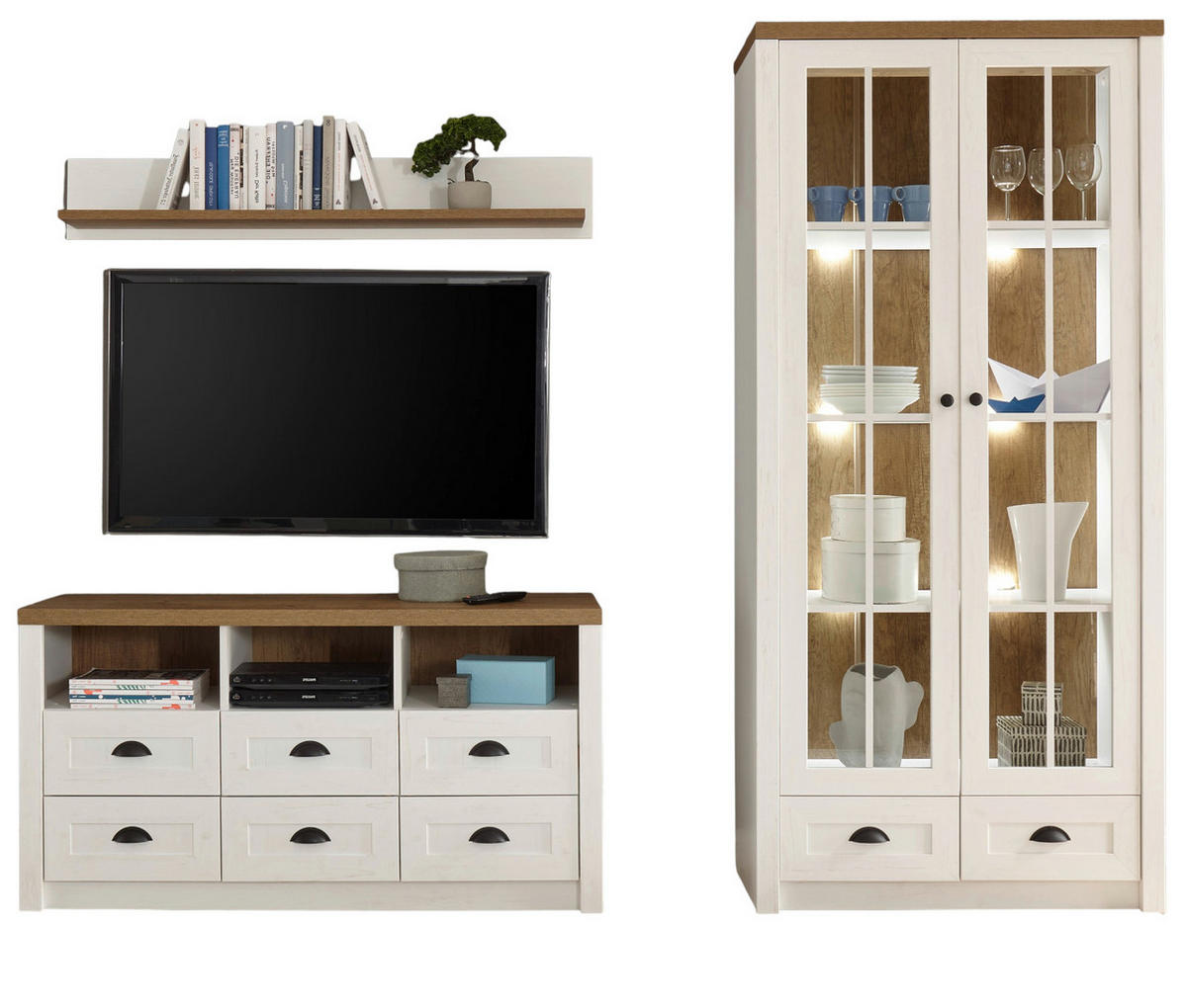Furn.Design WOHNWAND weiß Pinie, Eiche hell 3-teilig 240 cm, Wohnkombination Landhausstil
