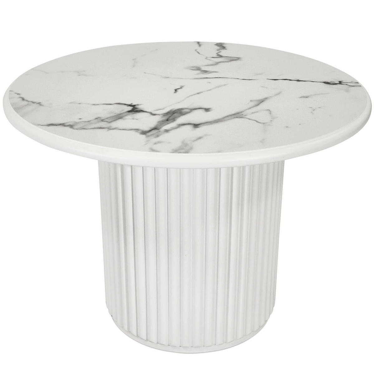 Der Easy Couchtisch in Weiß mit Marmoroptik und einem Durchmesser von 60 cm bietet eine stilvolle Kombination aus skandinavischer Schlichtheit und moderner Funktionalität. Die kratzfeste Melaminbeschichtung in Marmoroptik sorgt für eine edle Optik, während der stabile Mittelfuß mit vertikaler Lamellenstruktur das Design perfekt abrundet.