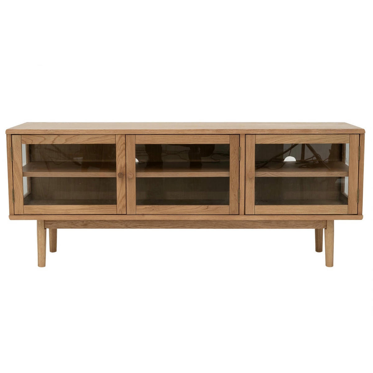 - Materialzusammensetzung: Rahmen und Beine aus massiver Eiche, Böden und Rückwand aus MDF-Eichenfurnier, Türen und Seiten aus gehärtetem Glas, Eiche Furnier, Lackiert