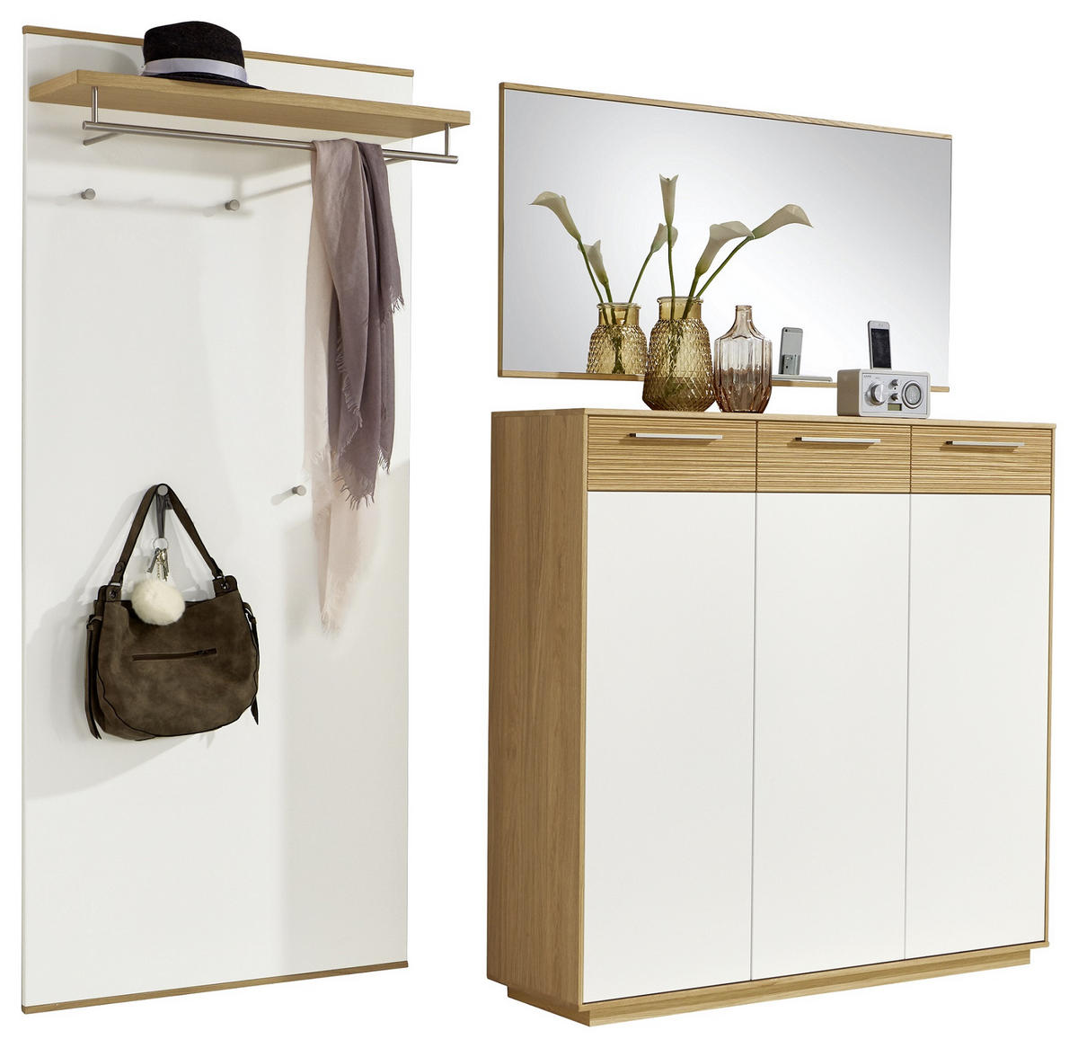 Garderobe (3-teilig) in Weiß und Eichefarben: wohnlicher Look fürs Entree
