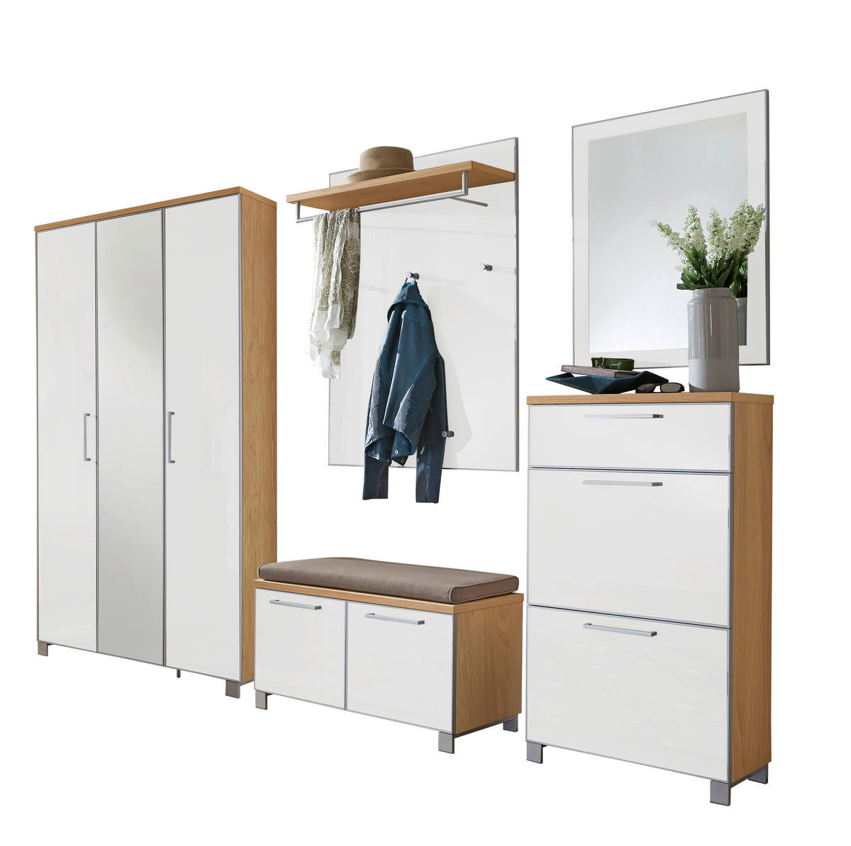 Garderobe (6-teilig) ca. 245 x 195 x 40 cm (B x H x T) in Weiß & Eichefarben
