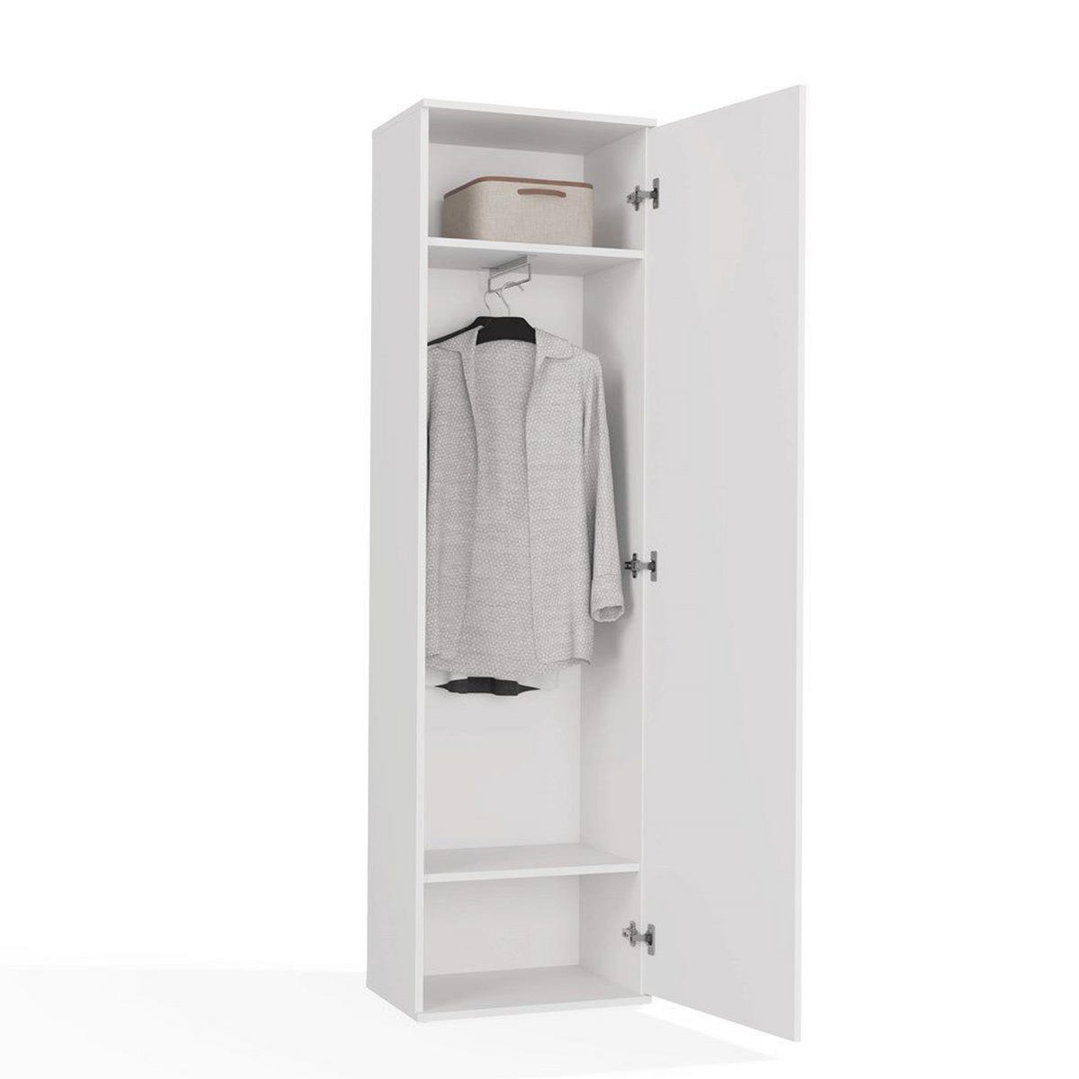 Die „DUO“ Garderobe zeichnet sich nicht nur durch ihre moderne Ästhetik aus, die Schlichtheit mit Eleganz verbindet, sondern auch durch ihre praktische Ausstattung. Ein großer Kleiderschrank, ausgestattet mit einem einladenden Spiegel, bietet im Inneren zwei nützliche Regale und eine robuste Kleiderbügelhalterung. Flexibilität wird groß geschrieben, da die Schranktüren nach Wunsch links oder rechts montiert werden können.