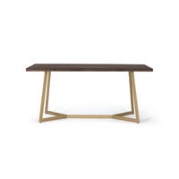 Ein Esstisch aus Mangoholz mit Metallgestell. Seine Abmessungen betragen 76 cm hoch, 170 cm breit und 90 cm tief. Es hat die Farbe Walnuss und Gold, wiegt 45 kg und wird in 2 Paketen geliefert.