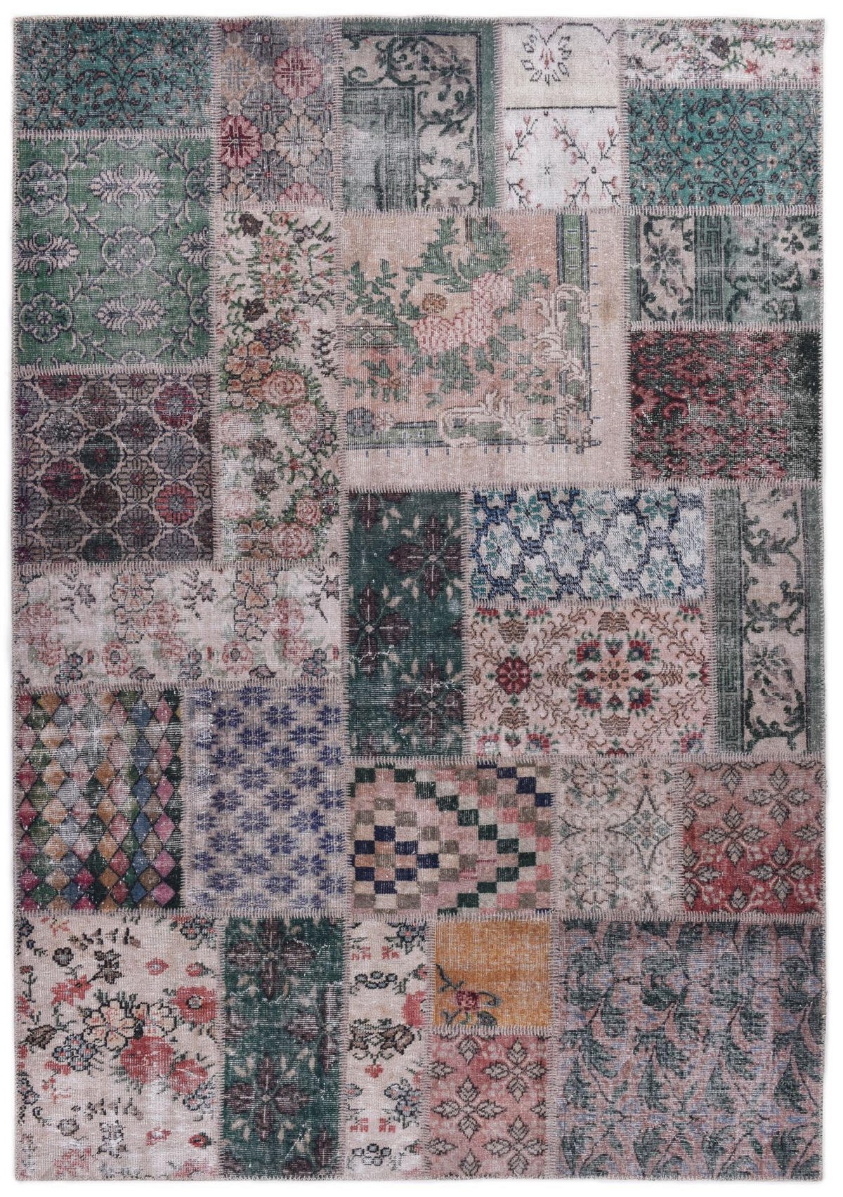 Eine Homage an feine Vintage Stoffe, so lautet das Motto dieses Adara Designs. Es scheint so als wären für diesen Teppich ganz besondere, etwas verblichene Stoffstücke kunstvoll aneinandergenäht worden.