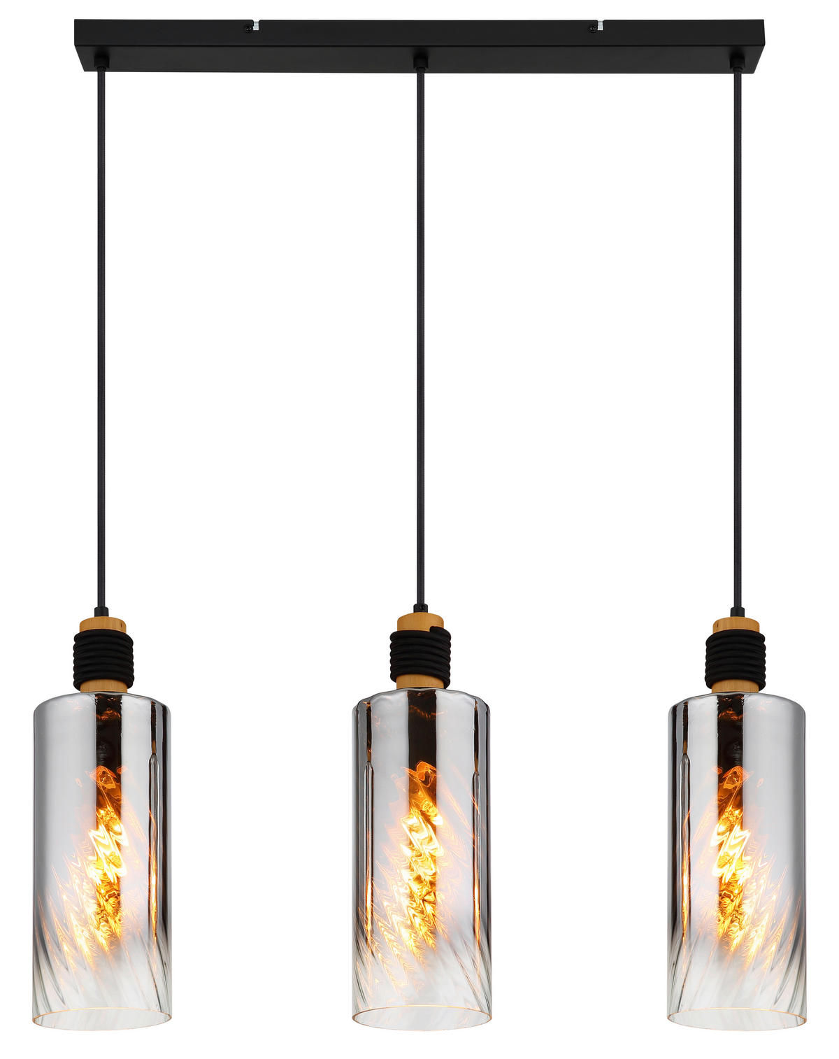 Textil, Holz, Metall und Rauchglas.