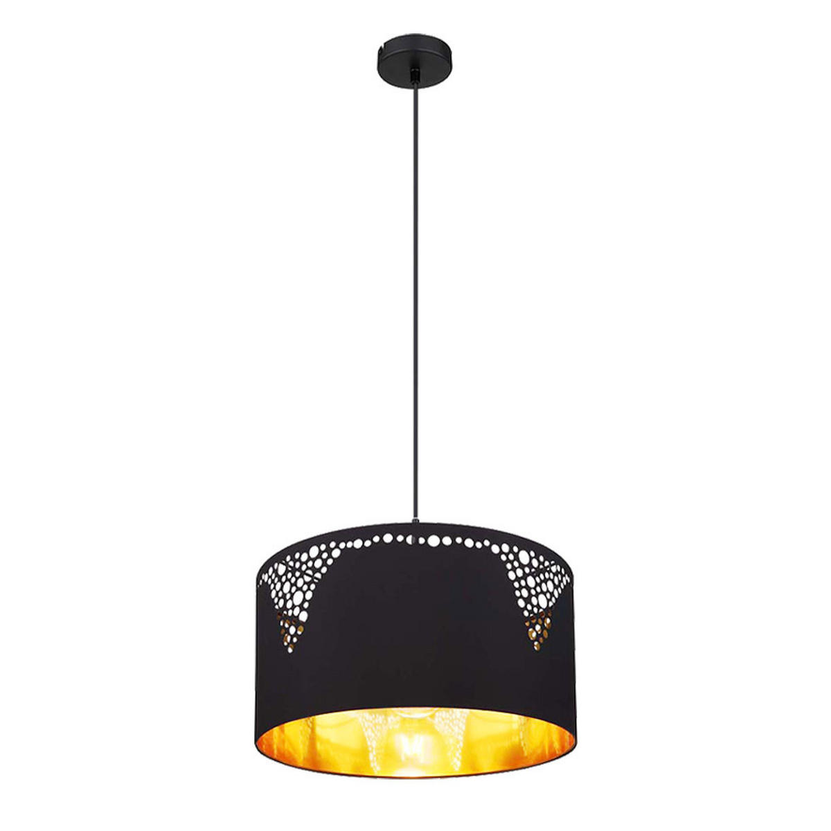 Diese modern gestaltete LED Hängeleuchte besticht durch ihr matt schwarzes Metallgestell und einen textilen Lampenschirm in elegantem Gold. Die dekorativen Stanzungen im Schirm erzeugen eine ansprechende gemusterte Lichtwirkung und sorgen für eine wohnliche Atmosphäre. Mit einer Höhe von 120 cm und einem Durchmesser von 38 cm ist die Leuchte ideal über Esstischen oder in Wohnzimmern einsetzbar. Das enthaltene Leuchtmittel garantiert direktes, angenehmes Licht und ermöglicht eine stimmungsvolle Beleuchtung Ihres Raumes. Die Leuchte kommt ohne Schalter und mit IP20 Schutzart, wodurch sie sich für den Innenbereich perfekt eignet.