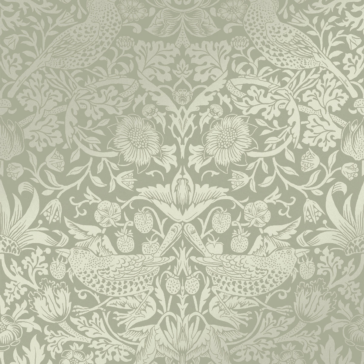 Verändern Sie Ihr Interieur mit der raffinierten William Morris at Home Tapete Strawberry Thief Fibrous Sage. Die sanfte salbeigrüne Hauptfarbe, kombiniert mit dem unverwechselbaren Blumen- und Laubmuster, verleiht jedem Raum einen Hauch von Ruhe und Raffinesse. Das einzigartige Muster zeigt Vögel, die in England als "Erdbeerdiebe" bekannt sind, inmitten üppiger Erdbeeren und verleiht Ihrer Einrichtung ein charmantes und unverwechselbares Element. Das Metallic-Finish verleiht der Tapete einen subtilen Glanz, während die glatte Qualität ein nahtloses und professionelles Aussehen gewährleistet.