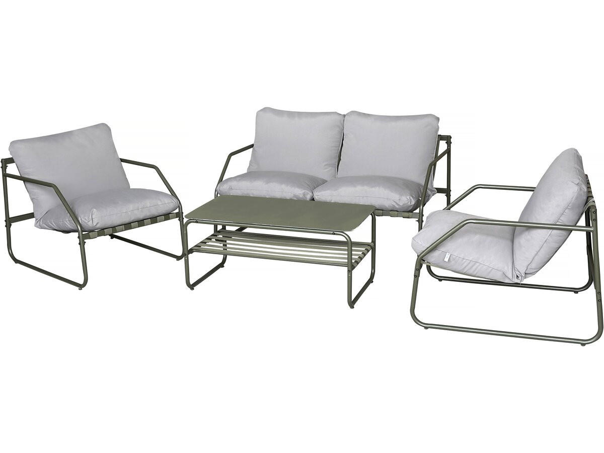 Gartenmöbel "Sora" - 4-Sitzer - GrünDie Gartengarnitur "Sora" 4-Sitzer ist ideal, um einen geselligen und modernen Bereich im Freien zu schaffen. Sie besteht aus einem 2-Sitzer-Sofa, zwei Einzelsesseln und einem Couchtisch und passt perfekt in Gärten, auf Terrassen und Balkone. Sein Gestell aus grünem Metall verleiht einen zeitgenössischen Touch und garantiert gleichzeitig Solidität und Stabilität. Das 2-Sitzer-Sofa misst 128 x 82 x 62 cm und bietet optimalen Komfort für entspannende Momente. Die Einzelsessel mit den Maßen 66 x 82 x 62 cm vervollständigen das Ensemble harmonisch. Der Couchtisch 90 x 50 x 41 cm ist ideal zum Abstellen von Getränken und Accessoires. Diese Lounge wurde für den Gebrauch im Freien konzipiert, hält den äußeren Bedingungen stand und ist leicht zu pflegen. Ihr schlichtes Design passt zu jedem Einrichtungsstil. Die Lounge "Sora" eignet sich perfekt, um Familie und Freunde zu empfangen. Sie vereint Komfort, Haltbarkeit und moderne Ästhetik, um Ihren Außenbereich zu verschönern.Design 4-Sitzer Gartenmöbel aus Metall mit Kissen "Sora" - Abmessungen 2-Sitzer-Sofa: 128 x 82 x 62 cm - Abmessungen Einzelsessel: 66 x 82 x 62 cm - Abmessungen Couchtisch: 90 x 50 x 41 cm - grün .Struktur: Stahl