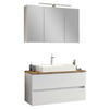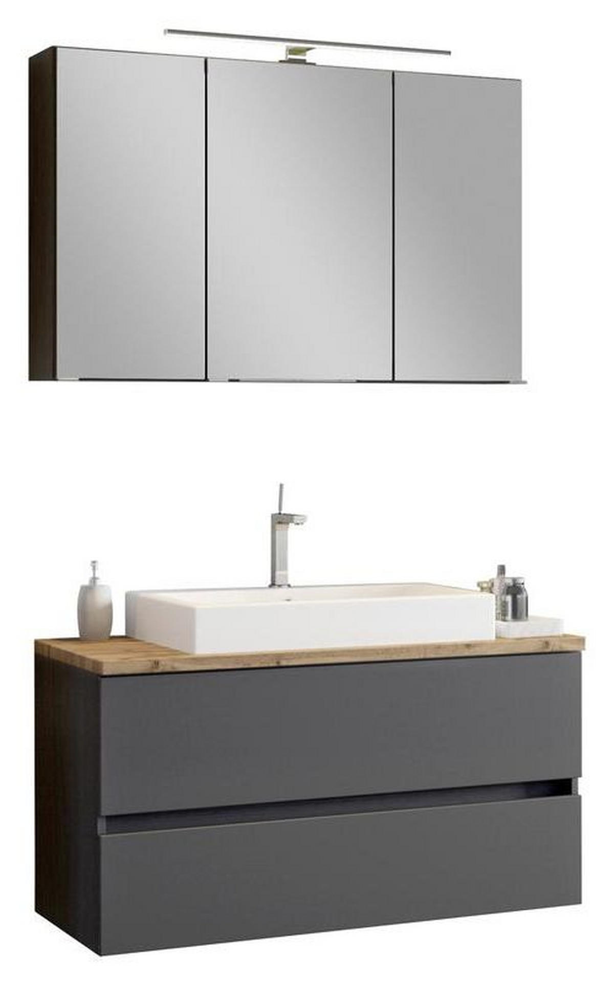 Dieses Badezimmer mit Spiegelschrank und Waschbecken vereint praktischen Stauraum mit einem trendigen Look. Ihr Equipment können Sie nicht nur im Spiegelschrank einsortieren, sondern auch in den 2 Schubladen des ca. 100 x 52 cm (B x H) großen hängenden Waschbeckenunterschranks. Von seinem melaminharzbeschichteten Korpus in Grau setzt sich die Oberplatte in Eichefarben effektvoll ab.