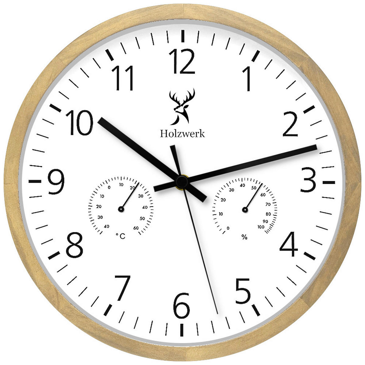 Erleben Sie den Charme von echtem, handgefertigtem Holz mit unserer Holzwerk Wanduhr im modernen Design. Mit praktischen Anzeigen für Temperatur und Luftfeuchtigkeit. Diese einzigartigen Unikate aus robustem, massivem Holz in warmem Beige oder rustikalem Braun und schlichtem Zifferblatt in Weiß, machen diese Uhr zu einem unverzichtbaren Accessoire für Ihr Zuhause.