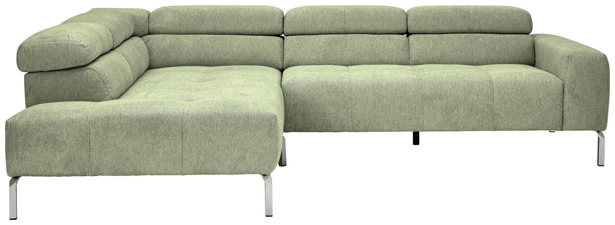 Absolut sehenswert Mit seiner lichten Farbgebung in Olivgrün ist das Polstermöbel ein geschmackvoller Blickfang im Interior-Konzept. Hohe Winkelfüße aus mattem Eisen in Chromfarben verleihen dem Design das gewisse Etwas und schaffen offene Bodenfreiheit.