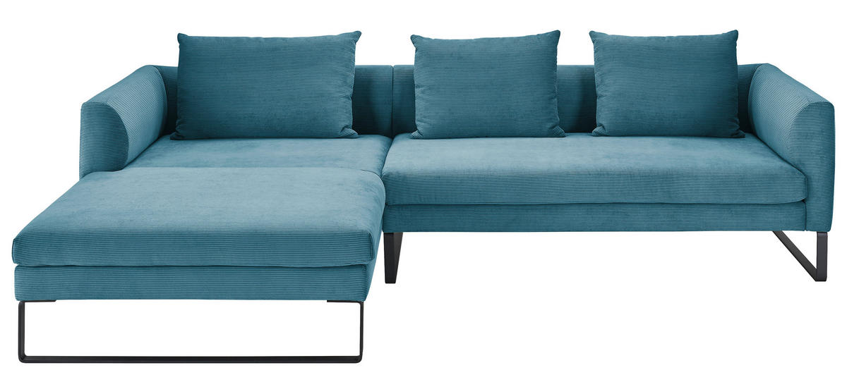 Genießen Sie Ihr Rendezvous mit der wohligen Unbeschwertheit des Seins auf diesem petrolfarbenen Ecksofa mit Cord-Bezug!