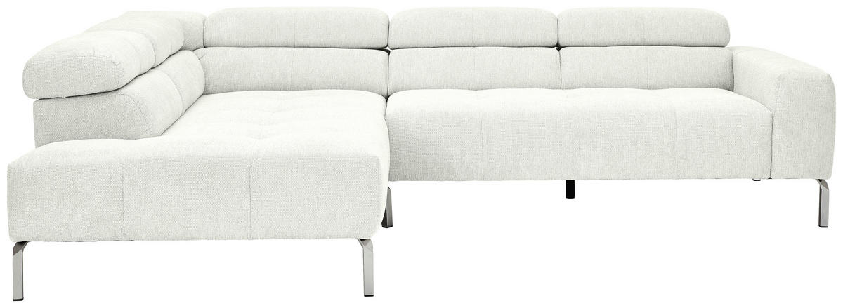 Absolut sehenswert Mit seiner lichten Farbgebung in Weiß ist das Polstermöbel ein geschmackvoller Blickfang im Interior-Konzept. Hohe Winkelfüße aus mattem Eisen in Chromfarben verleihen dem Design das gewisse Etwas und schaffen offene Bodenfreiheit.