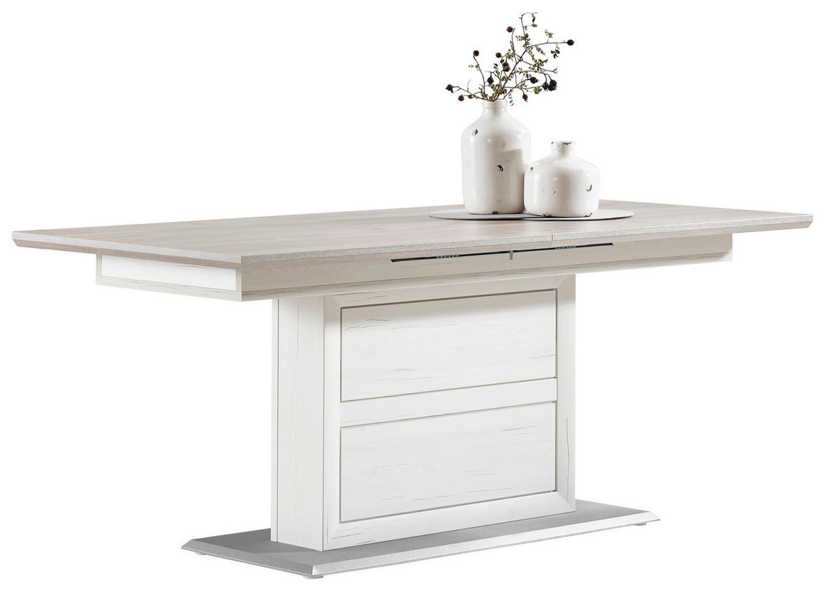 Dieser Esstisch interpretiert den Landhaustrend auf moderne Art. Das Esszimmermöbel von HOM´IN bezaubert mit seinem skandinavischen Charme. So erinnert die Säule in