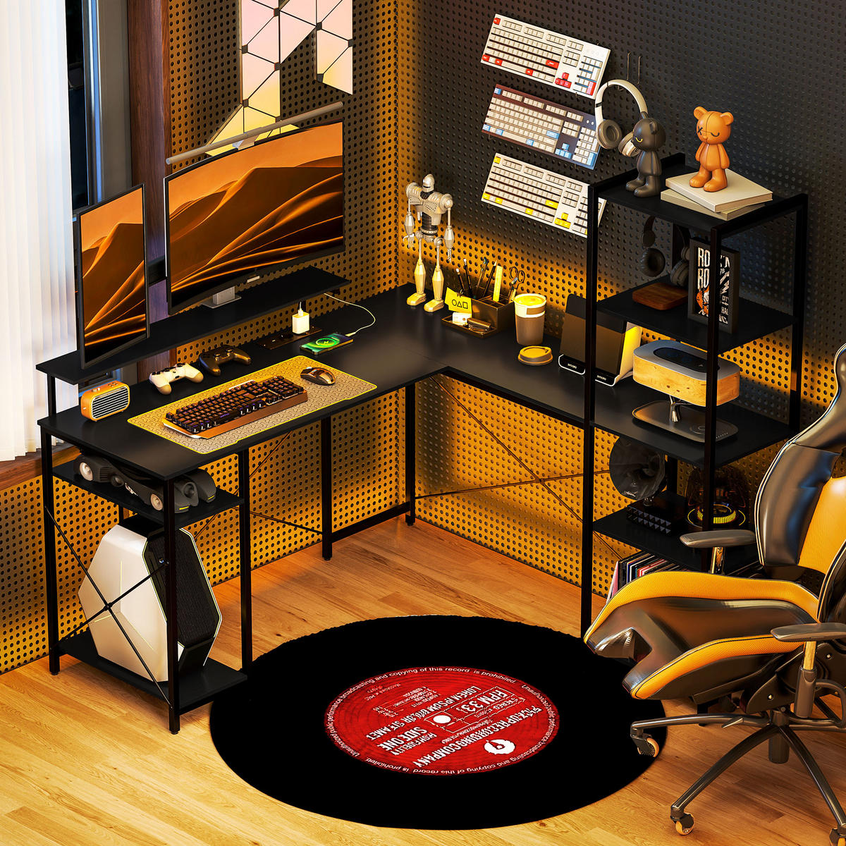 ● Ladestation mit Steckdose, USB-Anschluss und USB-C-Buchse; ● Ergonomischer Monitorständer des L-förmigen Schreibtisches hebt den Bildschirm auf Augenhöhe; ● L-förmiges Design des Eckschreibtisches passt perfekt in Ecken und spart Platz; ● Zweistufiges unteres Regal und fünfstufiges seitliches Bücherregal bieten ausreichend Stauraum; ● Robuste Spanplatte und Metallrahmen des Eckschreibtisches für Langlebigkeit; ● Verstellbare Fußpads sorgen für Stabilität auf unebenen Böden; ● Montage erforderlich;