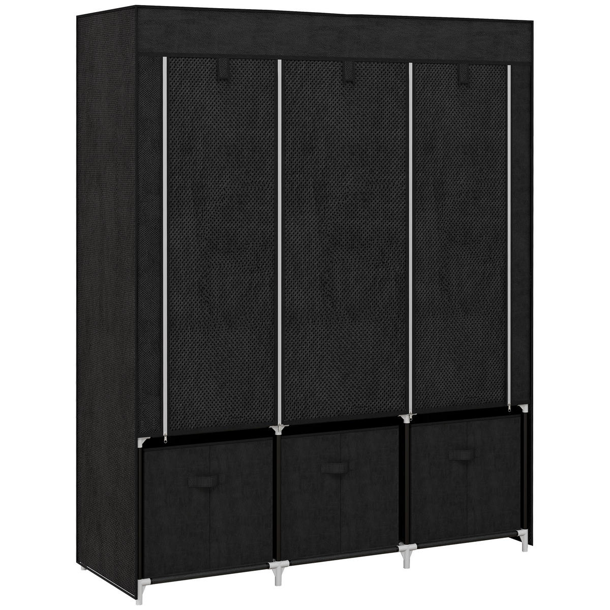 Mit diesem faltbaren Kleiderschrank aus Stoff von HOMCOM können Sie die Einfachheit in Ihrem Schlafzimmer in den Vordergrund stellen. Dank seiner praktischen und platzsparenden Eigenschaften können Sie den Schrank in Ihrem Schlafzimmer, Wohnzimmer oder an einem anderen Ort aufstellen. 5 offene Einlegeböden, 3 große Schubladen und 2 Hängeflächen bieten viel Platz für Ihre Kleidung. Der Bezug aus Vliesstoff hält Ihre Sachen staubfrei.