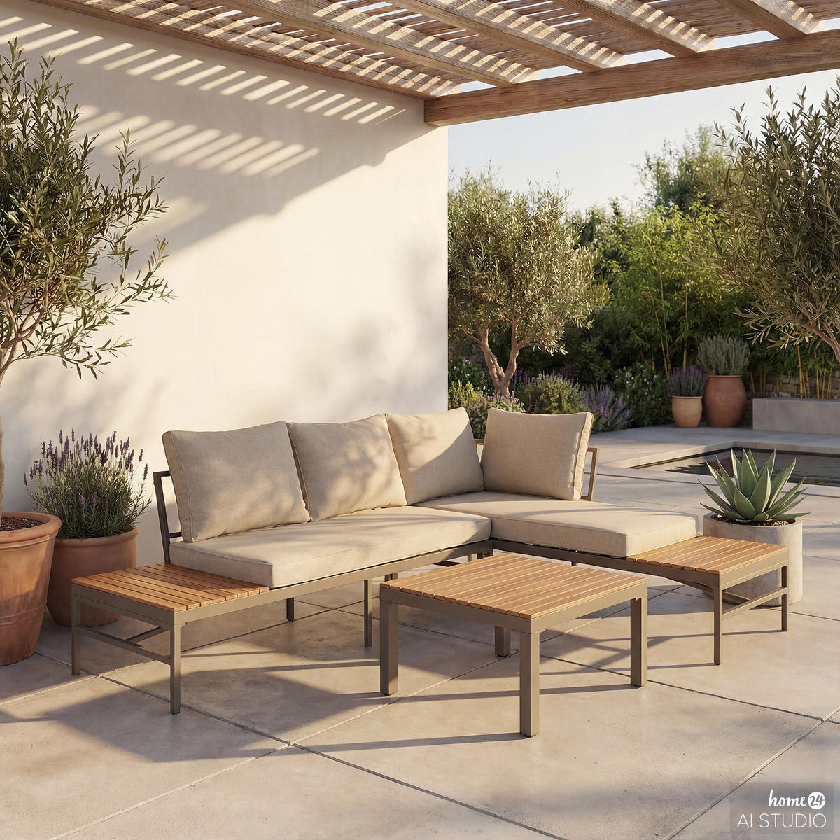 home24 LOUNGESET - 3-teilig - Webstoff / Akazie massiv - Beige / Akazie Braun