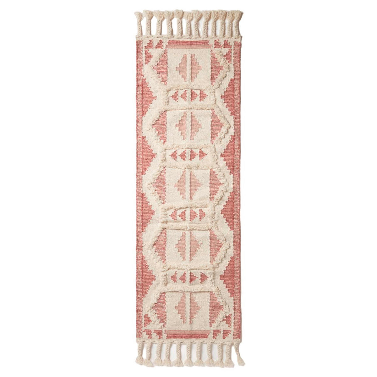 Sorgfältig handgewebter Kelim Teppich mit geometrischem Muster in Rosa und Cremeweiß und geflochtenen Fransen. Der kunstvoll gestaltete Teppich aus 75% Wolle und 25% Baumwolle ist in verschiedenen Größen erhältlich.