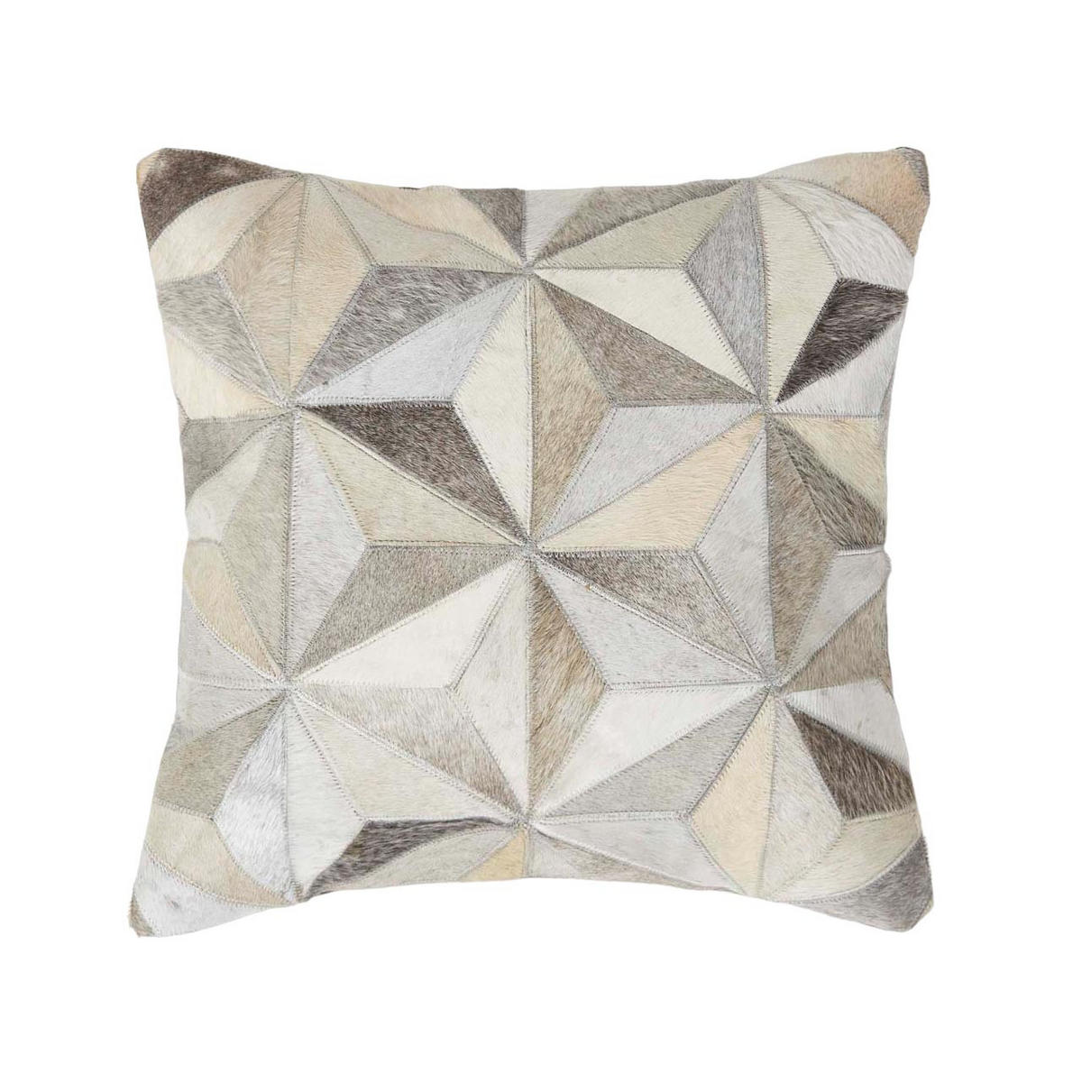 Dieses handgefertigte Kissen beeindruckt durch ein kunstvoll gestaltetes geometrisches Patchwork-Design aus echtem Fell und Leder. Sternförmig angeordnete Dreiecke in natürlichen Grau-, Beige- und Cremetönen fügen sich harmonisch zu einem eleganten Gesamtbild – jedes Kissen ist ein Unikat mit individueller Struktur. Die dunkelgraue Rückseite aus Veloursleder ergänzt das grafische Design mit einer edlen Note.