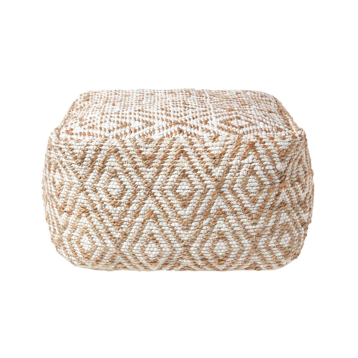Der handgefertigte Sitzpouf „Sierra“ im Format 60 x 30 cm überzeugt mit natürlicher Ausstrahlung und Ethno-Charme. Das dezente Rautenmuster in Natur- und Weißtönen bringt Struktur und Wärme in moderne oder boho-inspirierte Wohnräume – ideal als Bodenkissen, extra Sitzplatz oder stilvolle Ergänzung im Wohnbereich.Die Kombination aus nachhaltiger Jute und weicher Baumwolle sorgt für eine strukturierte Haptik und eine wohnliche Optik. Gefüllt mit formstabilen Polystyrolkügelchen ist der Pouf angenehm leicht, bietet aber dennoch bequemen Halt – perfekt für entspanntes Sitzen oder als bequemer Fußhocker. Ob einzeln oder im Set mit Sitzwürfel, rundem Pouf und Teppich der Serie „Sierra“ – das vielseitige große Bodenkissen rundet Ihr Einrichtungskonzept stilvoll ab. Für ein harmonisches Zuhause mit handwerklichem Charakter und natürlichen Materialien.