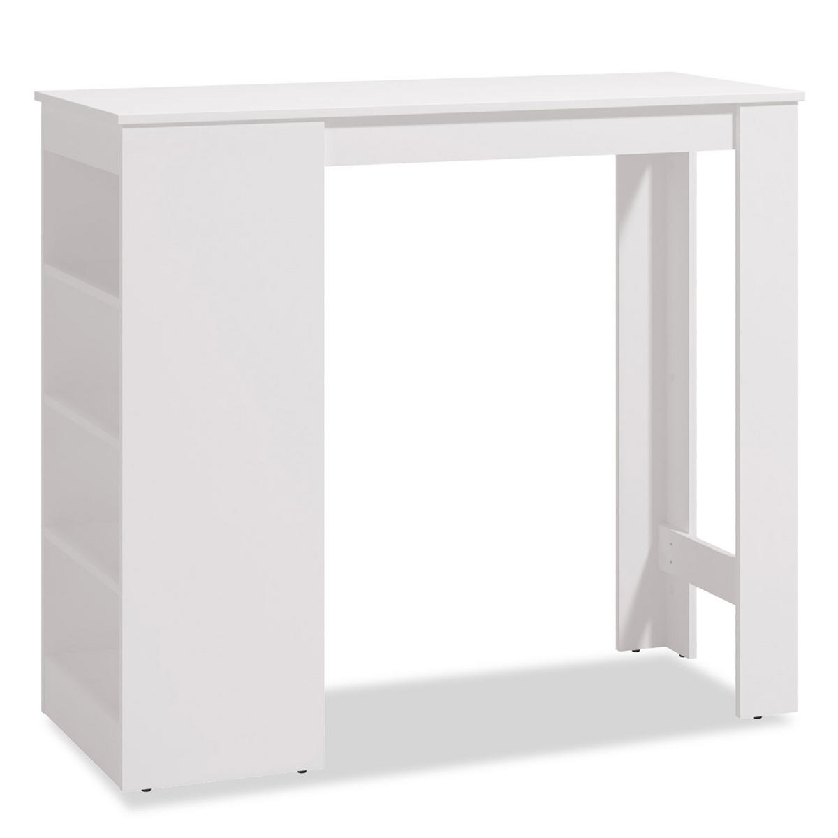 Der praktische Bartisch überzeugt sowohl durch das moderne Design, als auch seine Funktionalität. Mit einer Größe von 120x50 cm eignet sich der Tisch perfekt für kleine Wohnungen und ist somit die ideale platzsparende Lösung für Singles und Paare. Die edle weiße Farbe schafft ein angenehm warmes und wohnliches Flair. So lässt sich der Hochtisch problemlos in jede Küche oder auch ins Wohn- oder Esszimmer integrieren. Mit einer Stehhöhe von 105 cm läd der Holztisch nicht nur zum Essen und Trinken ein, sondern eignet sich auch als praktische Arbeitsfläche. Die melaminbeschichtete Oberfläche macht die Tischplatte dabei besonders pflegeleicht, kratz- und spritzwasserfest. An einer Seite sorgen 4 offene Regalfächer für praktischen Stauraum. So finden dort z.B. Teller, Gläser, schöne Deko oder Snacks ihren Platz und sind schnell zur Hand wenn sie gebraucht werden.