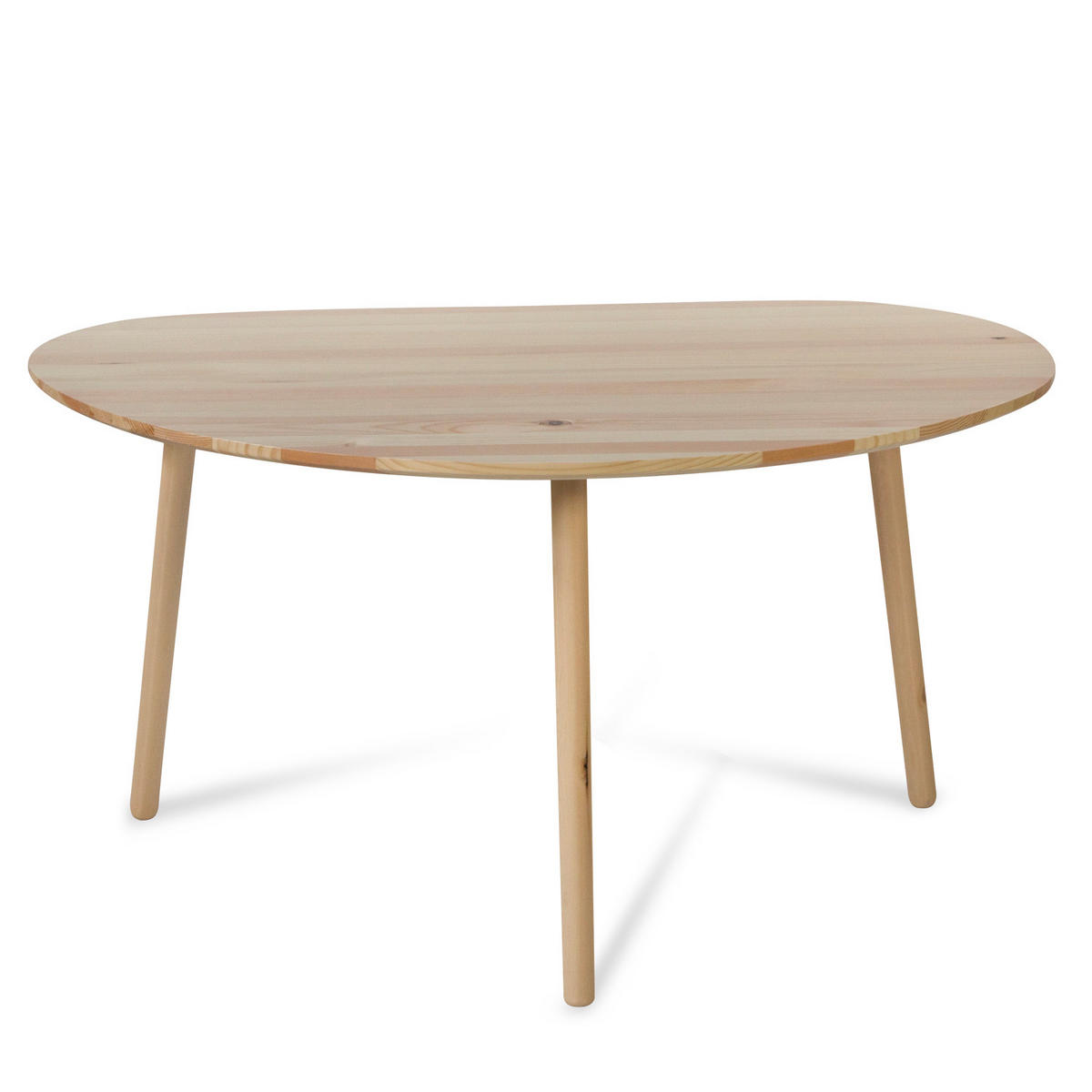 Moderner Beistelltisch im skandinavischen Stil aus Kiefernholz mit naturfarbener Tischplatte und 3 ausgestellten Tischbeinen. Der dekorative Holztisch lässt sich durch seine außergewöhnliche Nierenform perfekt als Couchtisch am oder neben dem Sofa platzieren. Zusätzlich bietet der kleine Wohnzimmertisch mit seiner großen Ablage genug Platz für schöne Dekorationen, Blumen, Zeitungen oder sonstige Accessoires. Durch das schöne zeitlose Design passt der Nierentisch bzw. Dreibeiner in jedes Wohnzimmer und schafft ein angenehmes warmes und wohnliches Flair.