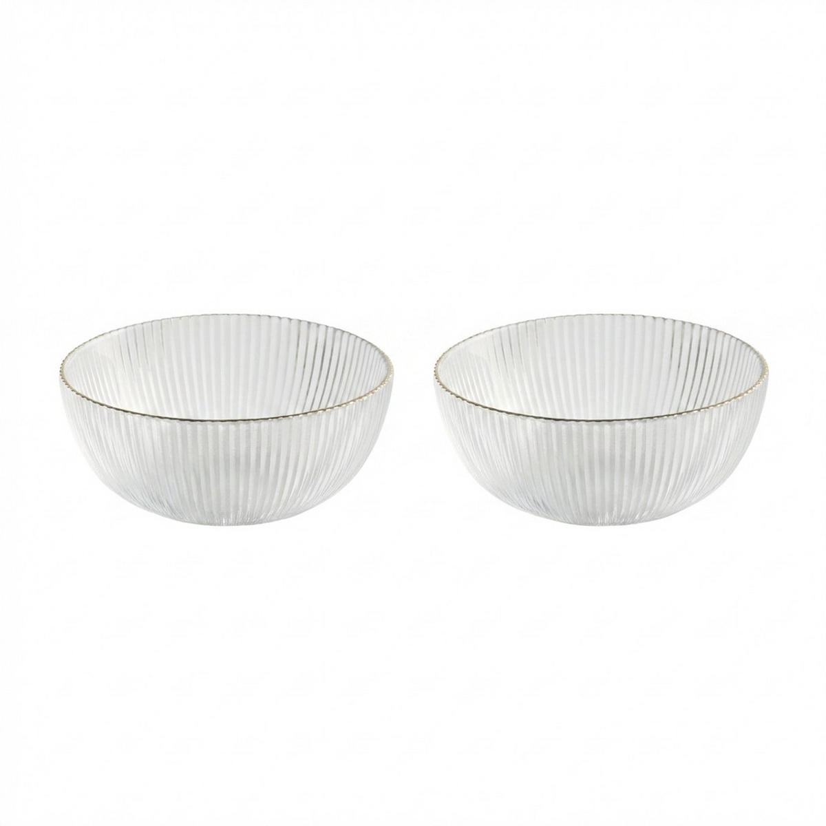 Das Riminis Schale 2er-Set aus klarem Kalk-Natron-Glas überzeugt mit einem eleganten Look und feinen Rillen im Glas. Der dezente Goldrand in mittlerem Gold setzt einen stilvollen Akzent – ideal zum Servieren von Salaten, Müsli, Obst, Snacks oder Desserts. Für den Kontakt mit Lebensmitteln geeignet.