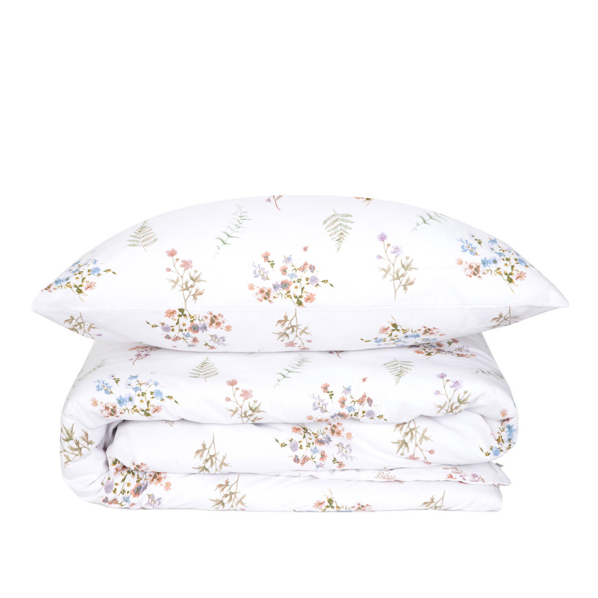 Die Bettwäsche FERN besteht aus einem Bettbezug mit den Maßen 200 x 220 cm und 2 Kopfkissen mit den Maßen 70 x 80 cm. Sie besteht aus Baumwolle und zeichnet sich durch ihre Weichheit aus. Sie ist sanft zur Haut und schafft ein angenehmes Schlafklima. Die weiße Oberfläche der Bettwäsche ist mit einem Muster versehen, das Frühlingsblumen darstellt und eine fröhliche Frühlingsatmosphäre in das Schlafzimmer bringt.