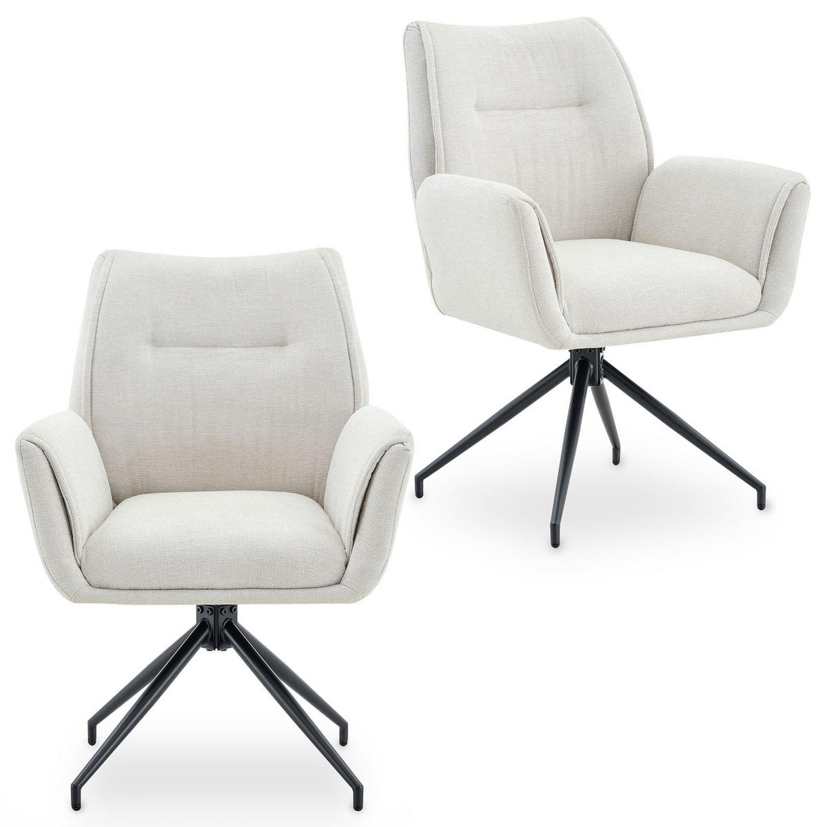 Esszimmerstühle LIRADie Esszimmerstühle LIRA im 2er Set verbinden modernen Komfort mit stilvollem Design. Der cremeweiße Stoffbezug verleiht den Stühlen eine elegante, zeitlose Ausstrahlung, während das schwarze Metallgestell einen modernen Kontrast setzt. Weich gepolsterte Sitz- und Rückenflächen, eine hohe Rückenlehne sowie gepolsterte Armlehnen bieten angenehmen Sitzkomfort. Dank 360° Drehfunktion sitzen Sie flexibel und bequem. Maximal belastbar bis 120 kg.Materialbeschreibung: