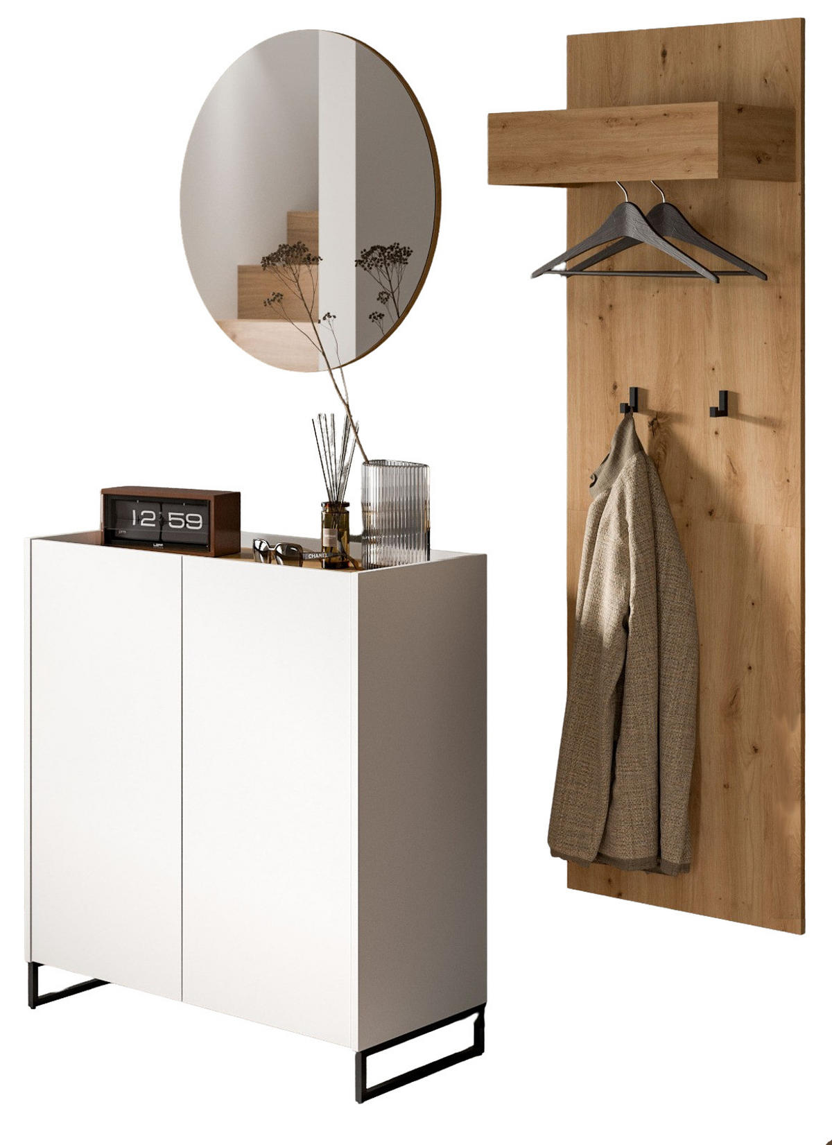 - Set bestehend aus: Garderobenpaneel, Garderobenspiegel, Schuhschrank, Aufbauanleitung, Montagematerial
