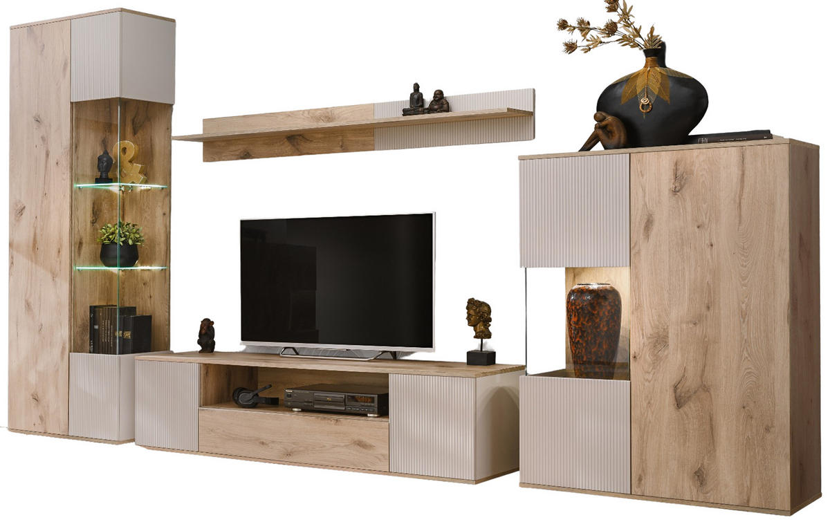 Inn.Furn WOHNWAND Eiche, Kaschmir 4-teilig 350 cm, Schrankwand inklusive Beleuchtung