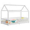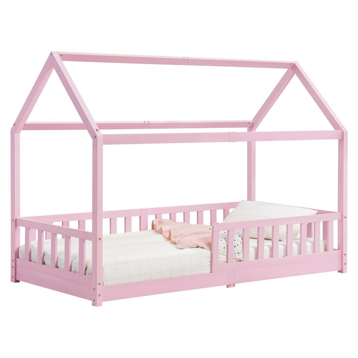 Kinderhausbett für kleine und große Abenteurer Das moderne Kinderbett Marli (200x90 cm, Rosa) mit Rausfallschutz, Matratze, Lattenrost und Dach ist ideal für Mädchen und Jungen von 3 bis 10 Jahren. Als gemütlicher Schlafplatz und Spielort verschönert das Hausbett jedes Kinderzimmer. Denn die Hausoptik mit offenem Dach bietet viele Möglichkeiten! Gestalten Sie das Bett mit Himmeldekoration, als Höhle oder ein abenteuerliches Spielbett. Besonders für junge Kinder bietet ein Gitter mehr Schutz und Sicherheit. Für einen langjährigen Einsatz ist das Holzbett durch das massive und pflegeleichte Kiefernholz die richtige Wahl.Produktmerkmale Bett mit Matratze: