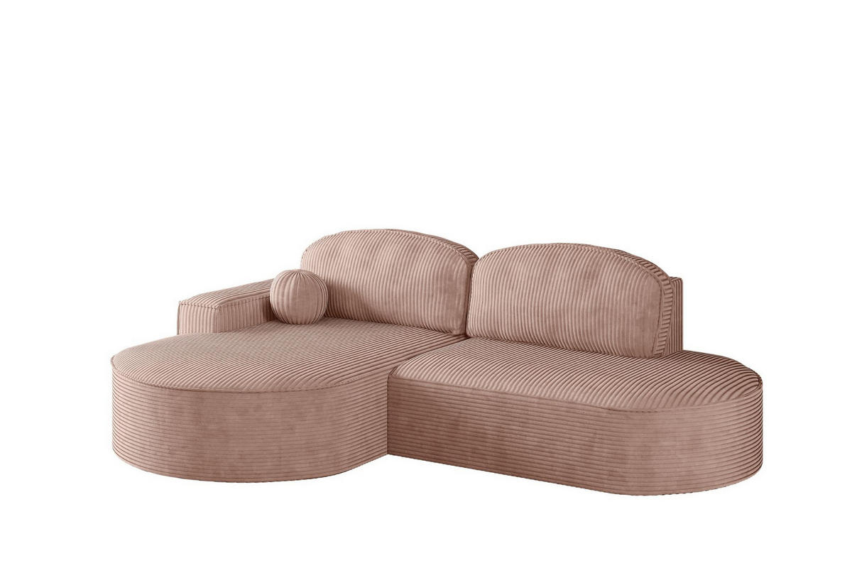 Elegantes Ecksofa mit großzügiger Liegefläche, Stauraum für Bettwäsche und modernem Cord-Stoff – ideal für zeitgemäße Wohnräume.