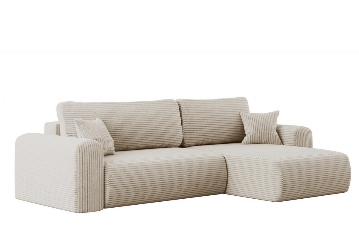 Die L-Form eignet sich ideal für Wohnzimmer, Gästezimmer oder multifunktionale Räume. Dank des DL-Systems lässt sich das Sofa mühelos in ein bequemes Bett (132×204 cm) verwandeln. Der integrierte Bettkasten bietet zusätzlichen Stauraum.