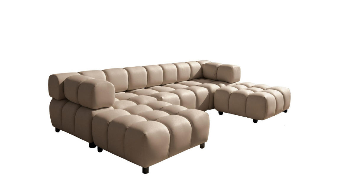 Exklusives Ecksofa BOLLA im weichen Veloursstoff Bluvel – tiefer Komfort und beeindruckende Form. Das Ecksofa BOLLA ist ein modernes, großzügiges Modulsofa mit weicher „Puff-Cube“-Optik. Die voluminösen Formen verleihen ihm einen luxuriösen Look und machen es ideal für große, offene Wohnräume. Die tiefe Sitzfläche und die breite Modulform bieten viel Platz und hohen Komfort – perfekt für Familien und moderne Interieurs. Bluvel ist ein hochwertiger Veloursstoff mit weicher, glatter Oberfläche und dezentem Glanz. Er ist abriebfest, farbstabil und angenehm warm – ideal für Premium-Designsofas. Die Polsterung aus T3038- und HR3020-Schaum bietet weichen, zugleich formstabilen Komfort. Das Sofa besitzt keine Schlaffunktion und ist als luxuriöses Komfortmodell konzipiert. Spezifikation: