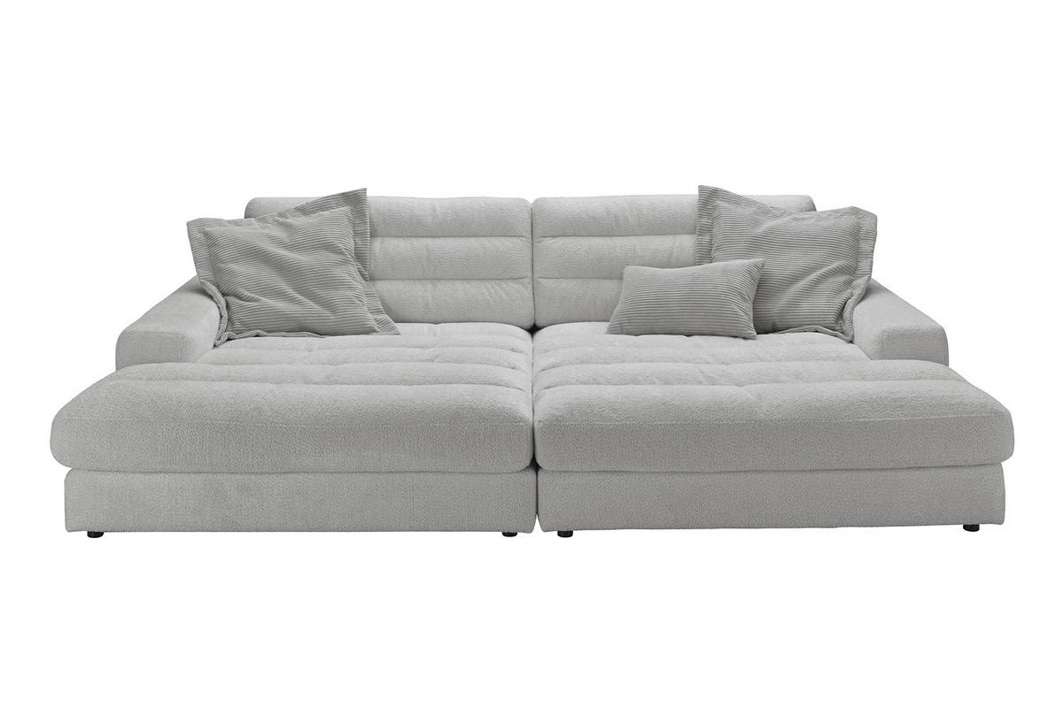 Das KAWOLA Big Sofa LANA begeistert mit Stil und Eleganz. Der angenehm weiche Bezug erinnert sowohl optisch als auch haptisch an Schafswolle und sorgt für flauschiges Sitzvergnügen. Das klassische Design verleiht dem Sofa eine zeitlose Schönheit, die Ihrem Wohnzimmer eine einzigartige Wohlfühl-Atmosphäre verleiht. Die Polsterung garantiert höchsten Sitzkomfort und passt sich der Körperform an. Sitzabdrücke sowie Wellenbildung der Bezüge sind warentypisch. Der Sitz besteht aus einer Unterfederung mit dauerelastischen Stahl-Wellenfedern und einer oberseitigen Abdeckung sowie lose Sitzkissen aus PUR-Schaum. Sitz und Rücken sind abgedeckt mit einem Inlett, welches befüllt ist mit hochwertigen Füllstoffen, die eine Beimischung von Federn enthalten. Um ein Stauchen des Füllmaterials zu verhindern, sollten die Sitz- und Rückenkissen nach Gebrauch aufgeschüttelt werden. Entspannen Sie auf dem KAWOLA Sofa LANA, und lassen Sie sich aus dem grauen Alltag entführen...