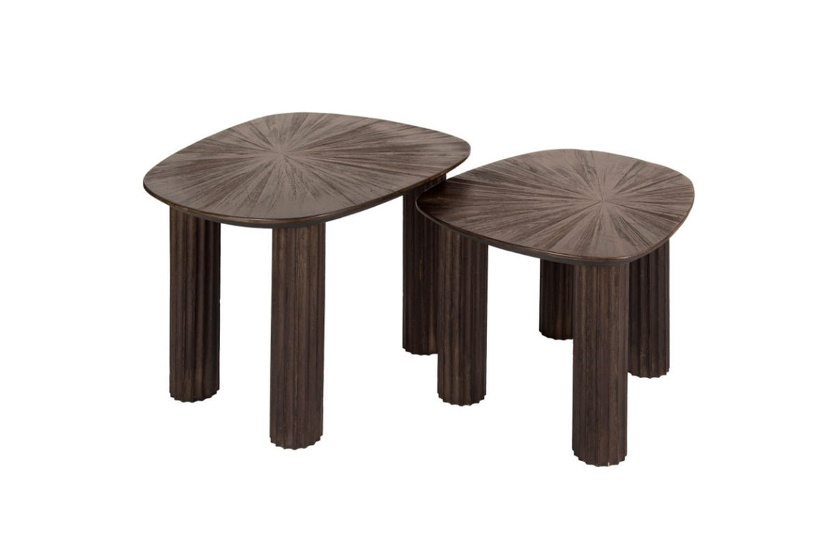 Das Couchtisch-Set INKA von KAWOLA bringt Natur und modernes Design in perfekte Balance. Die Tische wurden in einer organischen Form entworfen und aus hochwertigem Teakholz in einer modernen dunkelbraunen Farbe gefertigt. Diese Kombination sorgt dafür, dass diese Tische sowohl Stil als auch Haltbarkeit ausstrahlen. Die einzigartigen Beine mit Wellenmuster und das elegante Design der Tischplatte sorgen für einen verspielten und doch raffinierten Look. Das Set besteht aus zwei Tischen. Der höhere Tisch hat eine Fläche von 62 x 50 cm und eine Höhe von 43 cm, der niedrigere Tisch hat eine Fläche 54 x 44 cm von Höhe von 38 cm. Ob im Wohnzimmer, in der Lounge oder als stilvolle Ablage – das Couchtisch-Set INKA passt in jedes Zuhause und setzt ein echtes Design-Statement.