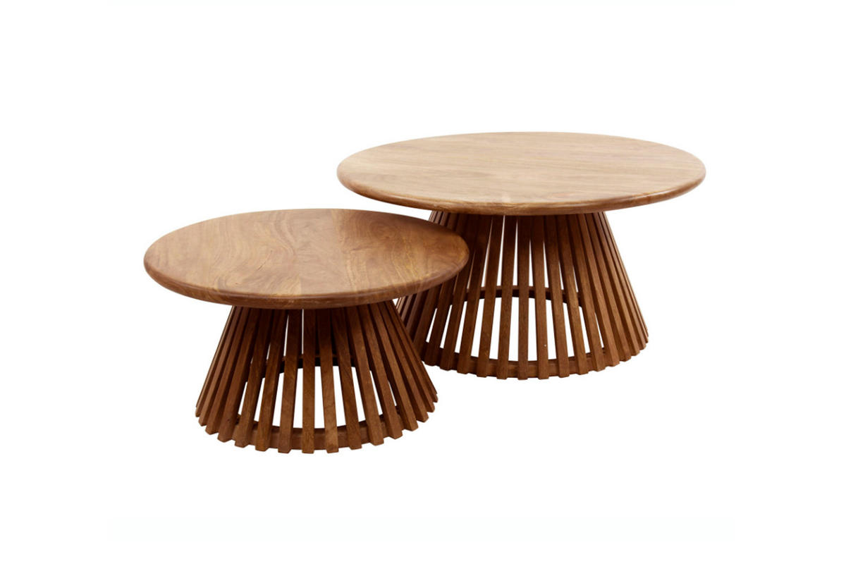 Das Couchtisch-Set LANI von KAWOLA bringt Natur und modernes Design in perfekte Balance. Es ist aus Mangoholz mit sandfarbener Oberfläche gefertigt. Die Tischplatten und die konisch geformten Rahmen der beiden Tische passen perfekt zusammen und sorgen für ein optisches Highlight in Ihrem Wohnzimmer. Dieses Set ist ein echtes Must-have! Es besteht aus zwei Tischen, die flexibel kombiniert werden können. Der größte Tisch hat einen Durchmesser von 80 cm und eine Höhe von 40 cm, der kleinere Tisch hat einen Durchmesser von 60 cm und eine Höhe von 32 cm. Die Rahmen haben an ihren breitesten Stellen einen Durchmesser von 59 cm bzw. 46 cm. Ob im Wohnzimmer, in der Lounge oder als stilvolle Ablage – das Couchtisch-Set LANI passt in jedes Zuhause und setzt ein echtes Design-Statement.