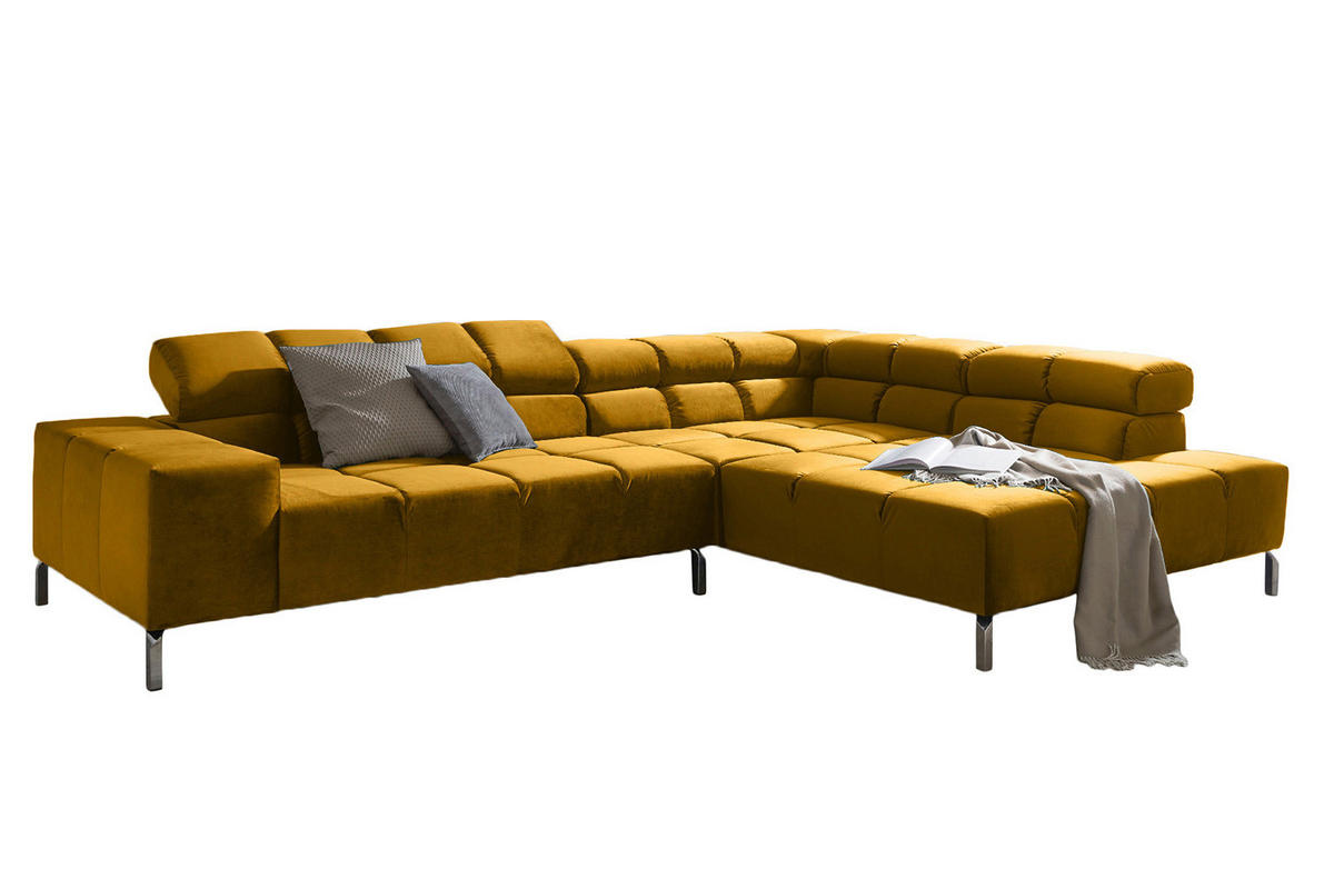 Das KAWOLA Ecksofa NELSON verbindet moderne Designwelten mit zeitloser Eleganz und fügt sich nahtlos in jedes Interieur ein. Seine kubische Form und die hohen Metallfüße verleihen dem Sofa eine gewisse Leichtigkeit, die durch die quadratischen Absteppungen noch unterstrichen wird. Die Kopfstützen können ganz nach den individuellen Sitzvorlieben entweder hoch-oder heruntergeklappt werden. Die komplexe, 3-stufige Polsterung garantiert außerdem höchsten Sitzkomfort, und für noch mehr Platz und Bequemlichkeit kann am Zweisitzer der Sofaecke per Knopfdruck die Sitztiefe verstellt werden. Selbstverständlich wurde das Sofa auch auf der Rückseite mit dem hochwertigen Velvet-Stoff bezogen, sodass es auch frei in den Raum gestellt eine gute Figur macht. Egal zu welcher Gelegenheit - auf dem Sofa NELSON findet jeder ein Plätzchen zum Entspannen!