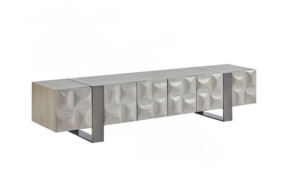Das KAWOLA Lowboard MARGO besticht durch seine elegante Kombination aus modernem Design und praktischer Funktionalität. Mit seiner Breite von 200 cm ist es der ideale Platz für Ihren Fernseher. Der Korpus und die Türen sind stilvoll mit hochwertigem grauen Ulmenholz furniert, das dem Möbelstück eine luxuriöse Optik verleiht. Die vier Türen bieten großzügigen Stauraum und lassen sich dank des Muldengriffes an der Oberseite mühelos öffnen. Die silberfarbenen Kufenfüße aus gebürstetem Edelstahl sorgen für einen modernen, zeitlosen Look und bieten gleichzeitig stabile Standfestigkeit. Das TV-Board MARGO von KAWOLA fügt sich perfekt in jedes Wohnambiente ein und ist ideal für Liebhaber von ausgefallenen, aber dennoch eleganten Möbelstücken. Entdecken Sie die perfekte Kombination aus Design und Funktionalität mit dem Sideboard MARGO!