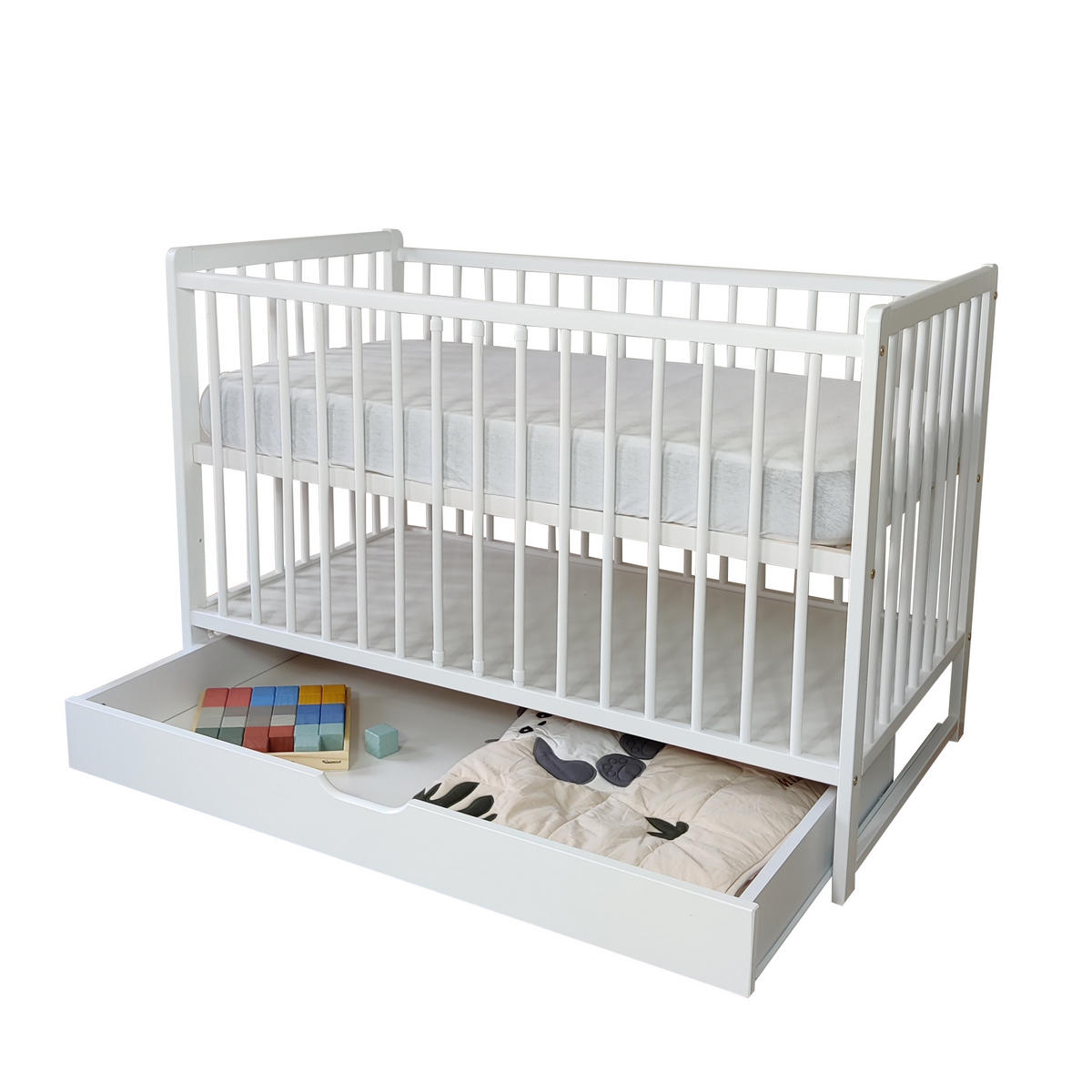 Unser Komplett-Set bestehend aus schönem Babybett in der Größe 60x120cm mit Schublade und punktelastischer Matratze mit waschbarem Bezug. Kein langes Suchen, hier haben Sie alles was Sie zum Start brauchen.