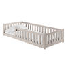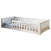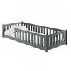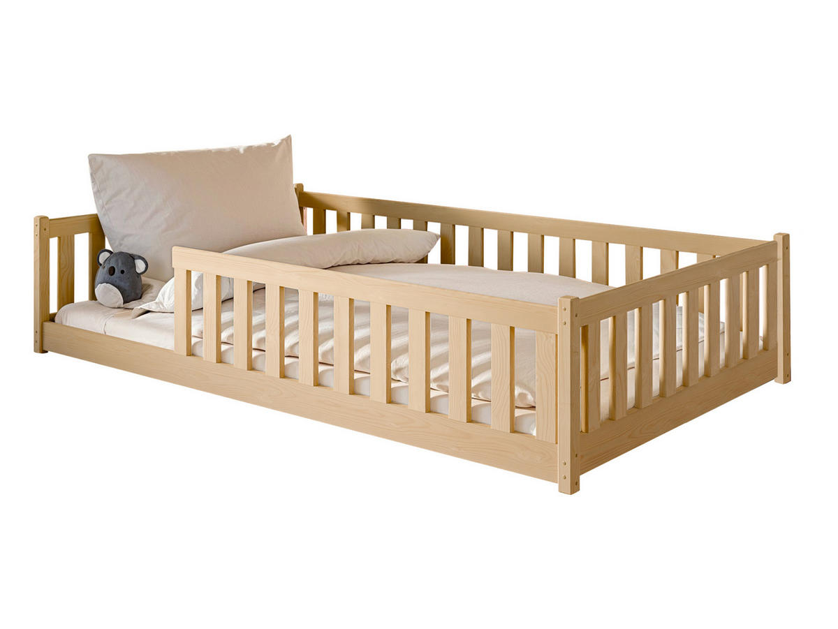 Entdecken Sie das perfekte Kinderbett, das nicht nur durch sein stilvolles Design, sondern auch durch seine hervorragende Funktionalität überzeugt. Dieses Bodenbett fügt sich nahtlos in jede Kinderzimmer-Einrichtung ein und schafft eine ruhige, entspannte Atmosphäre. Es ist ideal für Kinder, die aus ihrem Gitterbett herausgewachsen sind, aber dennoch ein sicheres und geborgenes Schlafgefühl benötigen. Die niedrige Höhe des Bettes ermöglicht es Ihrem Kind, eigenständig ins Bett zu steigen und dieses zu verlassen, was die Selbstständigkeit fördert und das Risiko von Verletzungen minimiert. Das stabile Gestell aus hochwertigem Kiefernholz sorgt für eine robuste Konstruktion, die auch den lebhaftesten Abenteuern Ihres Kindes standhält. Die abgerundeten Kanten und die glatte Oberfläche tragen zusätzlich zur Sicherheit bei und verhindern Verletzungen durch scharfe Ecken. Ein weiteres Highlight ist die multifunktionale Nutzung des Bettes. Tagsüber kann es als gemütlicher Rückzugsort zum Spielen, Lesen oder Entspannen genutzt werden. Mit einer großzügigen Matratzenfläche von 120x200 cm bietet das Bett ausreichend Platz, damit ein Elternteil bequem mit ins Bett einsteigen und abends Geschichten vorlesen kann. Die schlichte, aber elegante Optik lässt sich wunderbar mit bunten Betttextilien und Kuscheltieren kombinieren, wodurch das Bett schnell zum Lieblingsplatz im Kinderzimmer wird.