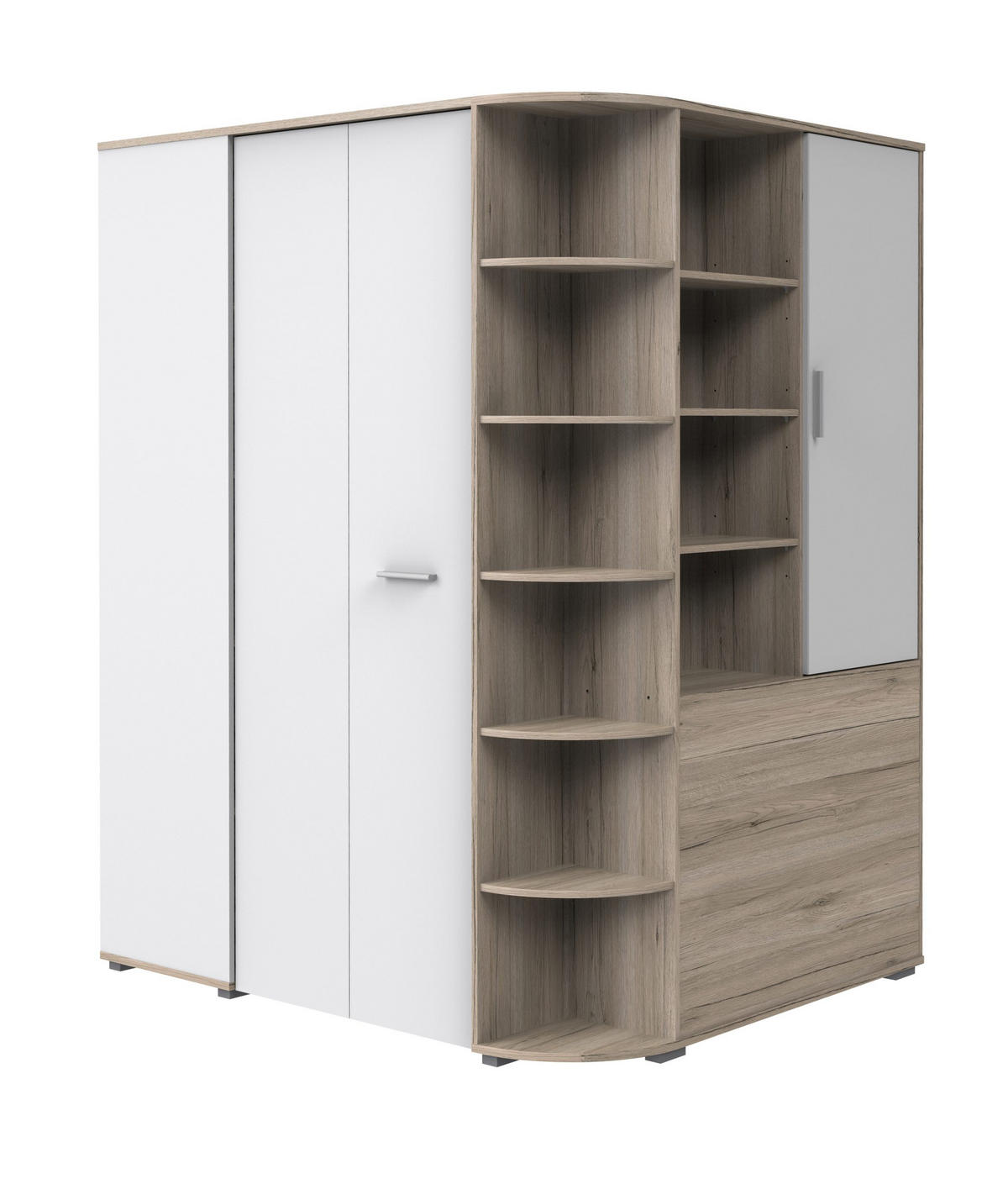 Entdecken Sie den Kleiderschrank Joker – die perfekte Kombination aus modernem Design, maximalem Stauraum und flexibler Ausstattung. In stilvollem Eiche San Remo mit Weiß Dekor passt sich dieser Schrank ideal an verschiedenste Wohnstile an.Begehbarer Eckkleiderschrank mit Falttür