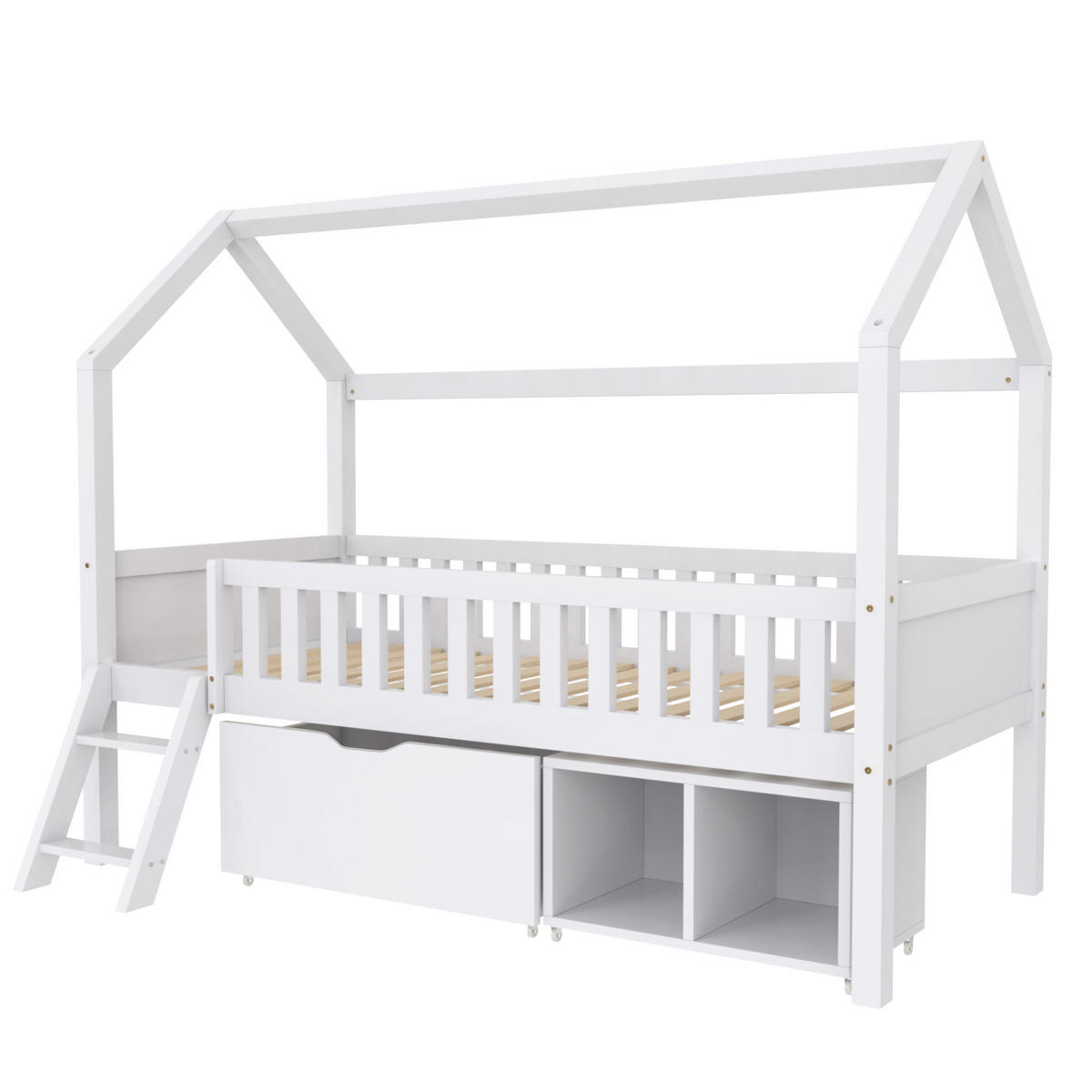 Multifunktional Befriedigt den Kletterspaß der Kinder. Neben dem Bett befindet sich eine zweistufige kleine Stufe, und die Oberseite hat eine Kreuzdachform, wodurch das gesamte Produkt interessant aussieht und den Vorlieben von Kindern gerecht wird. Inzwischen wurden Schubladen und Schränke für zusätzlichen Stauraum unter dem Bett hinzugefügt.