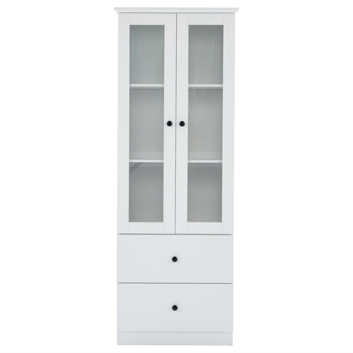 Hochwertige Materialien: Kombination aus MDF und Spanplatte in eleganter, matter weißer Ausführung. Gehärtetes Sicherheitsglas und hochwertige schwarze Rundgriffe unterstreichen das moderne Design.